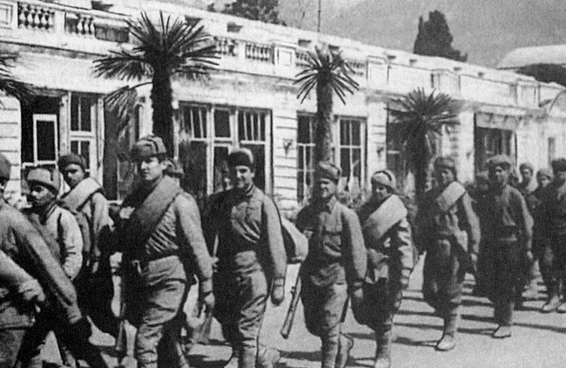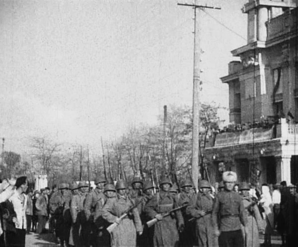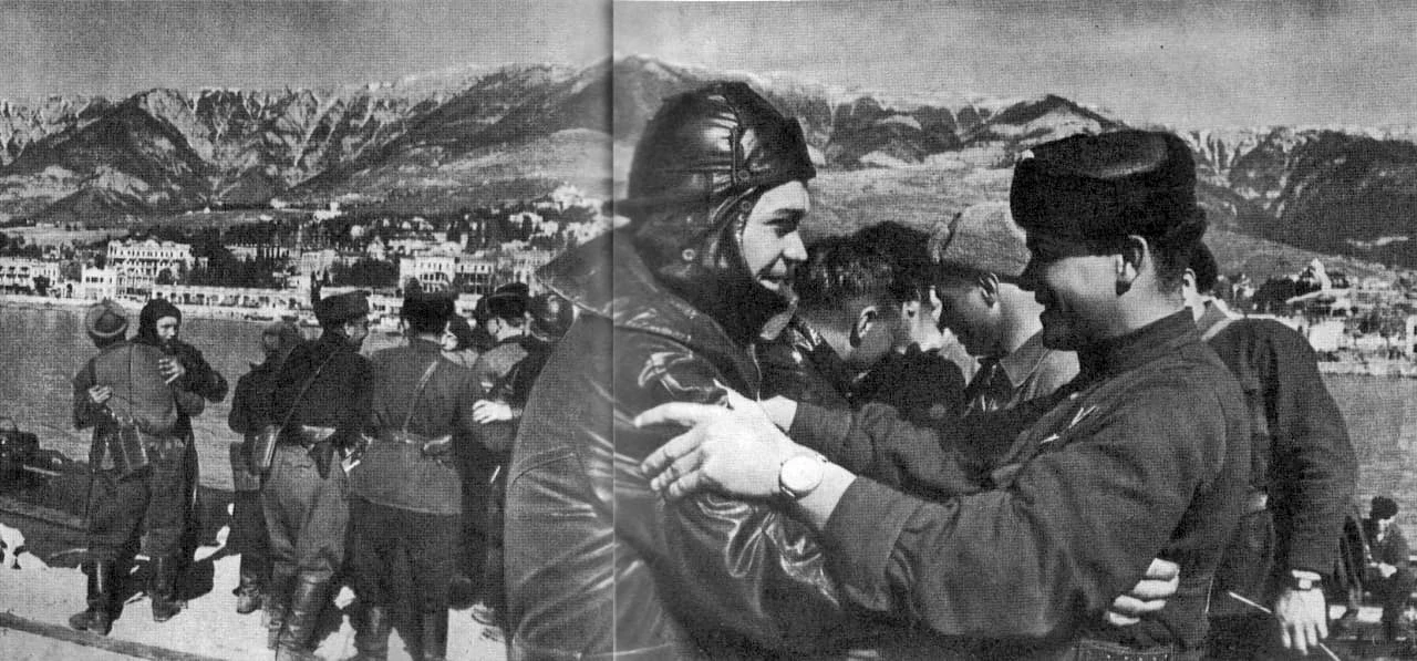 На исторических кадрах — встреча партизан и красноармейцев на набережной.