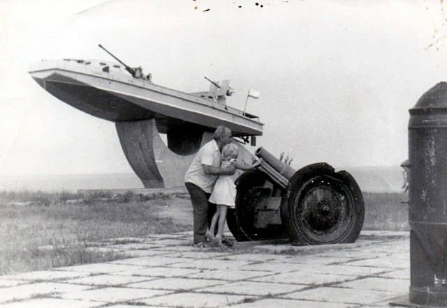 На этой фотографии из Героевского хорошо видно, что раньше рядом с мотоботом стояла еще и пушка. Снимок, на котором отец и дочь Сергея Новожилова, сделан в 80-х годах.