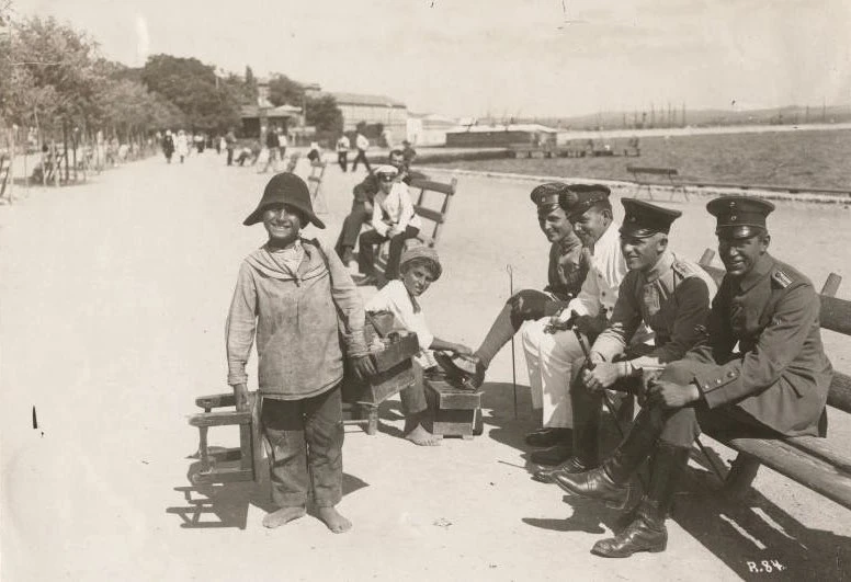 Улыбчивый чистильщик обуви и немецкие офицеры на керченской набережной. 1918 год — оккупация города.