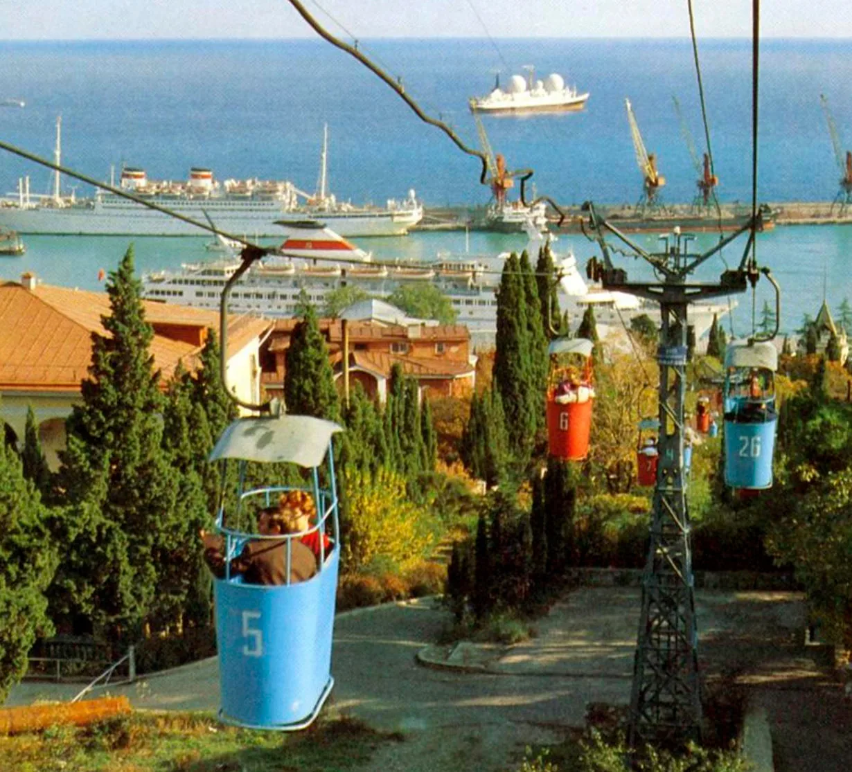 Разноцветные кабинки ялтинской канатки на фотографии 1982 года.
