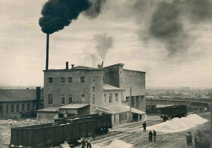 Гипсовый завод дымит над советской Керчью.