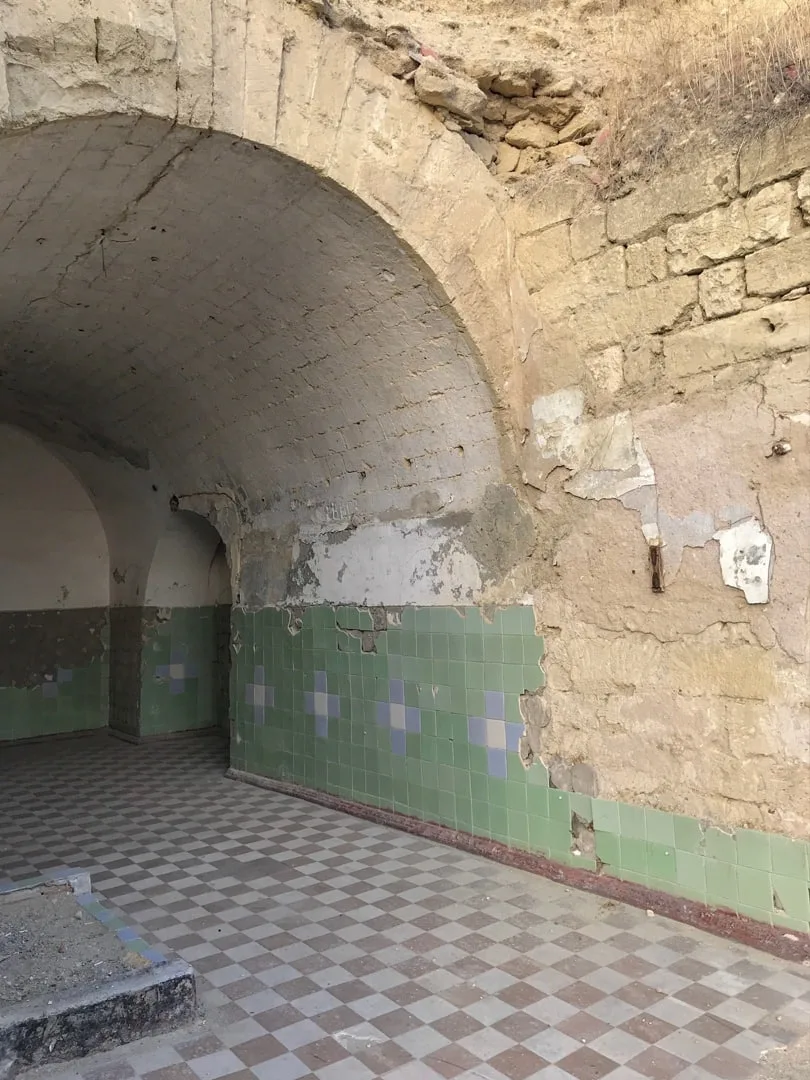 На старой каменной кладке сохранился советский кафель, который положили в капонире, обустраивая столовую дисбата.