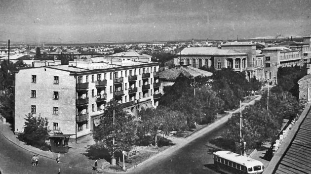 Исполкома ещё нет, а вдали по Кирова видны здания банка и гостиницы "Керчь".