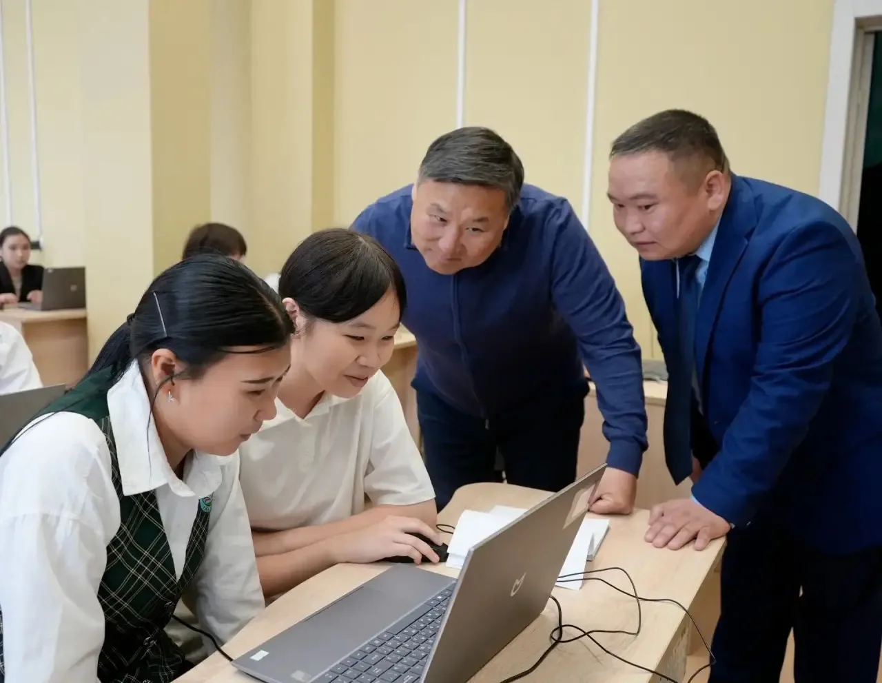 В ходе инспекции, помимо учебных классов, осмотрел спортзал и столовую, проверил организацию горячего питания. На уроке информатики убедился, что дети обеспечены современными ноутбуками. Библиотека также укомплектована на 100%.