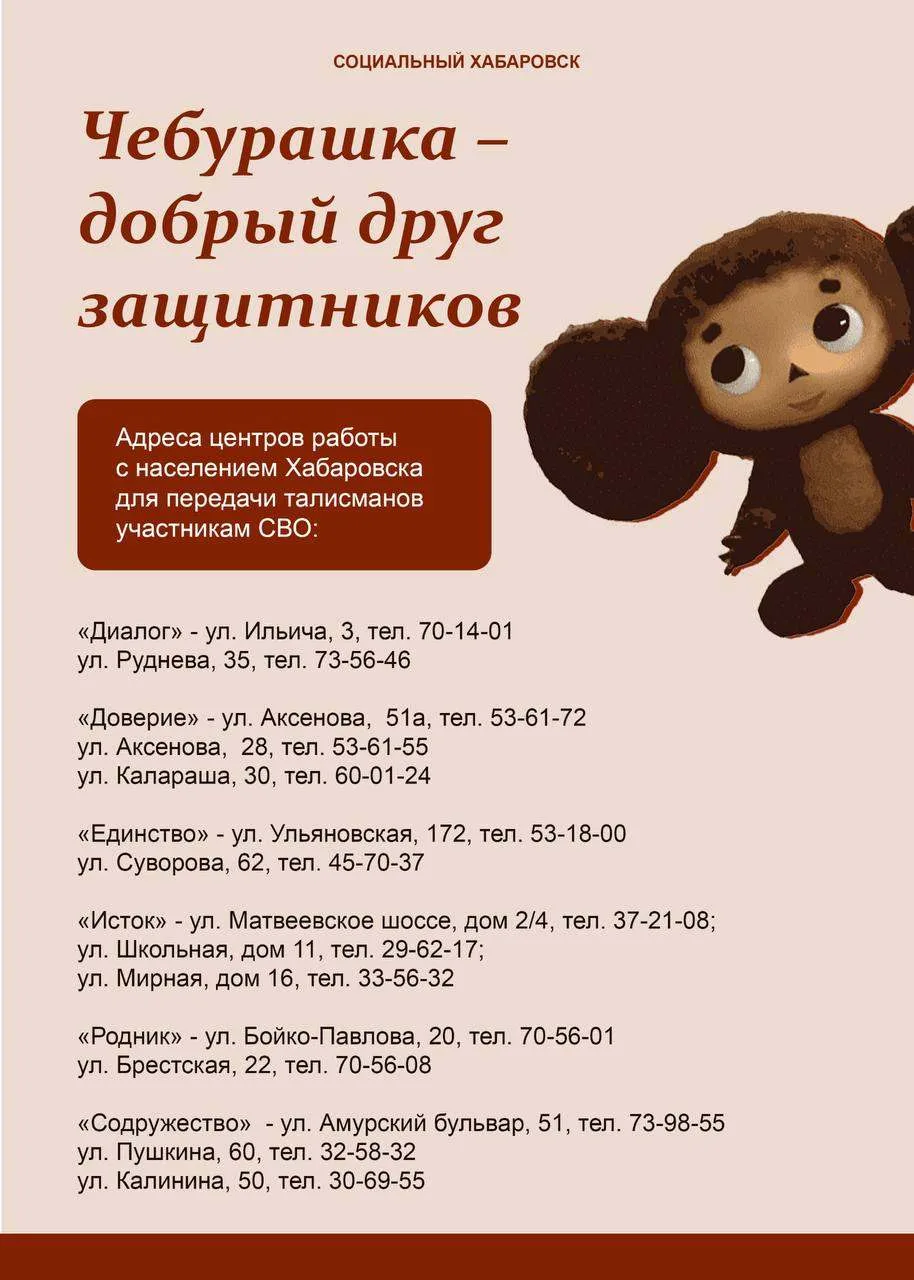 Создать Чебурашку своими руками и подарить его нашим Героям в преддверии Дня защитника Отечества предлагают хабаровчанам. Вместе с талисманом вы можете передать письма, открытки или рисунки.