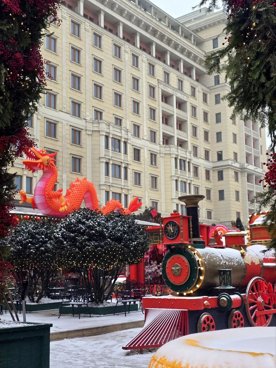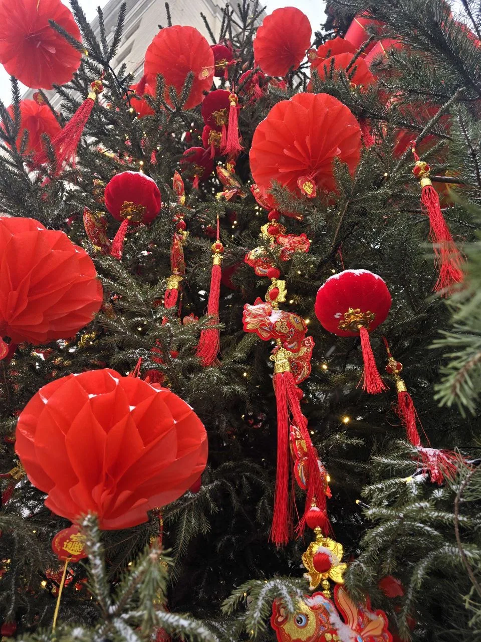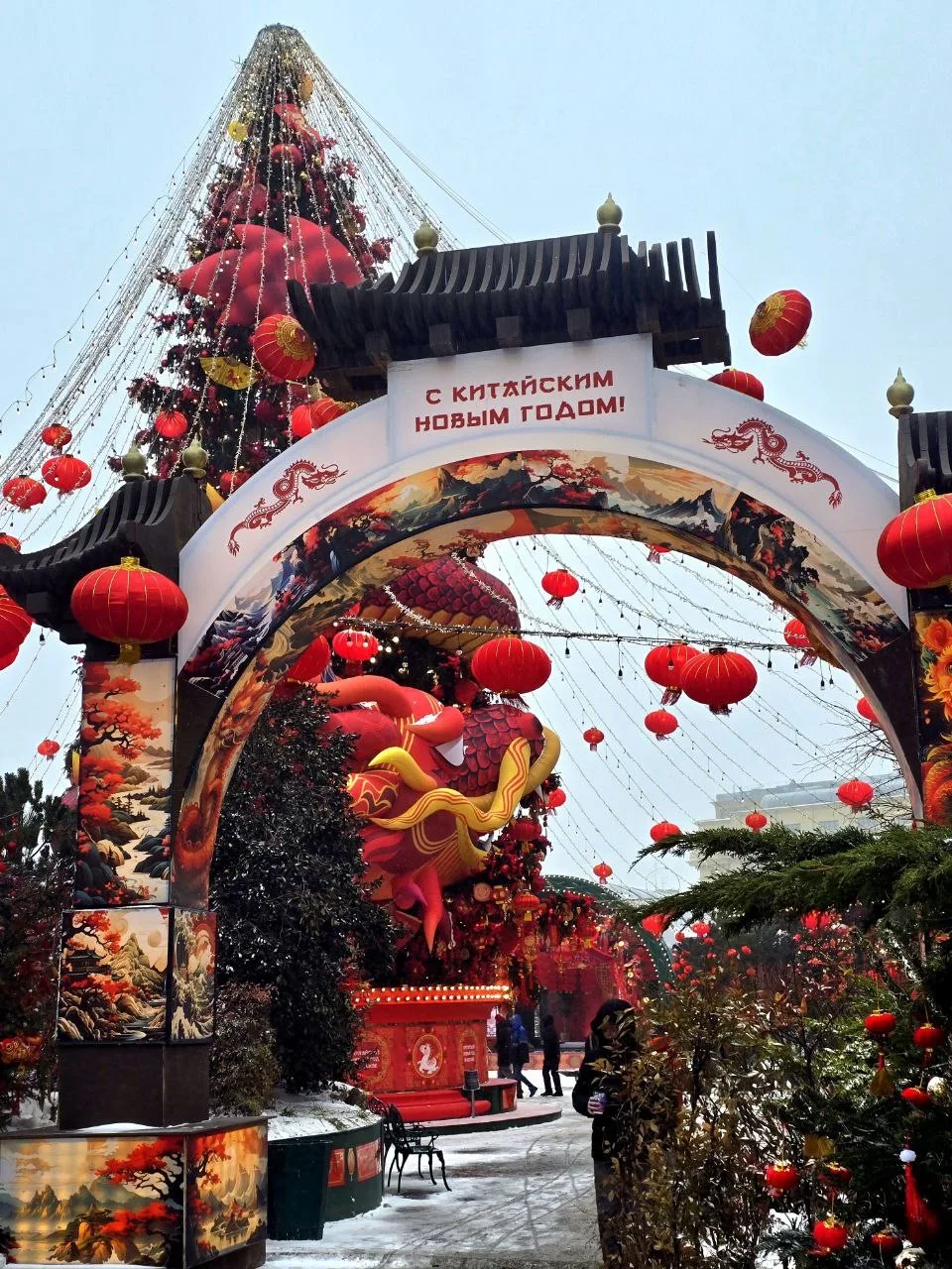 В центре установлена ёлка, которую обвивает огромный дракон. На дереве можно увидеть фонарики, подвески с кисточками, вееры, красные шары. А неподалёку расположились панды с мандаринами 🐼