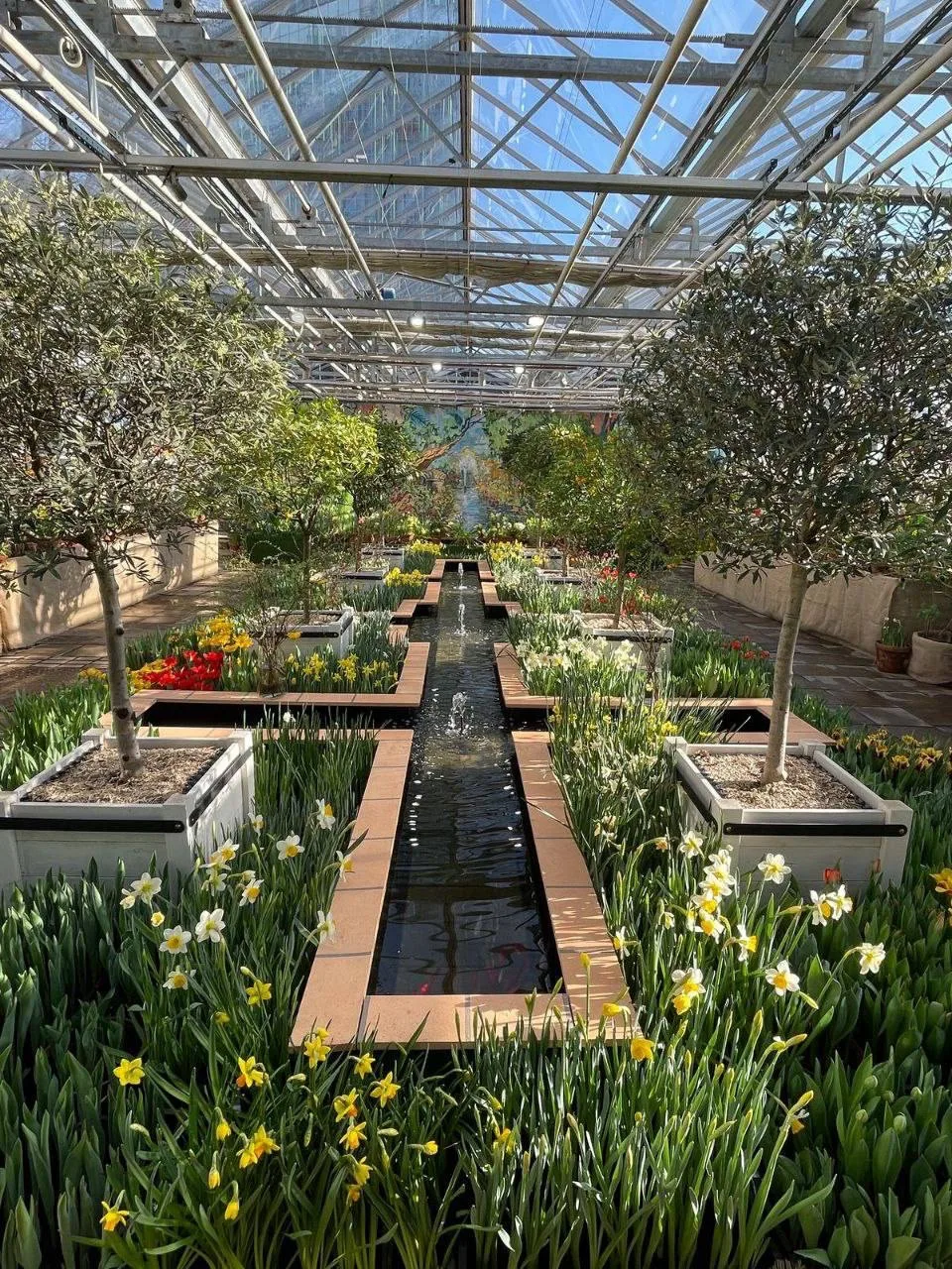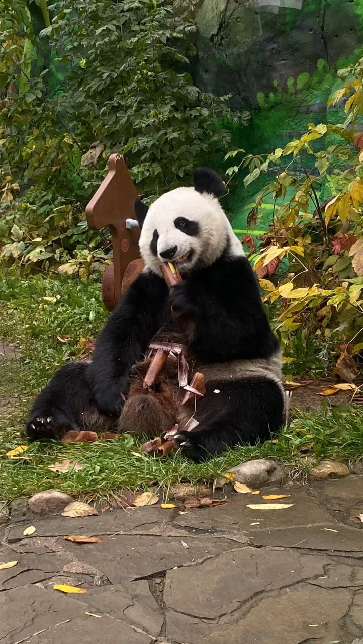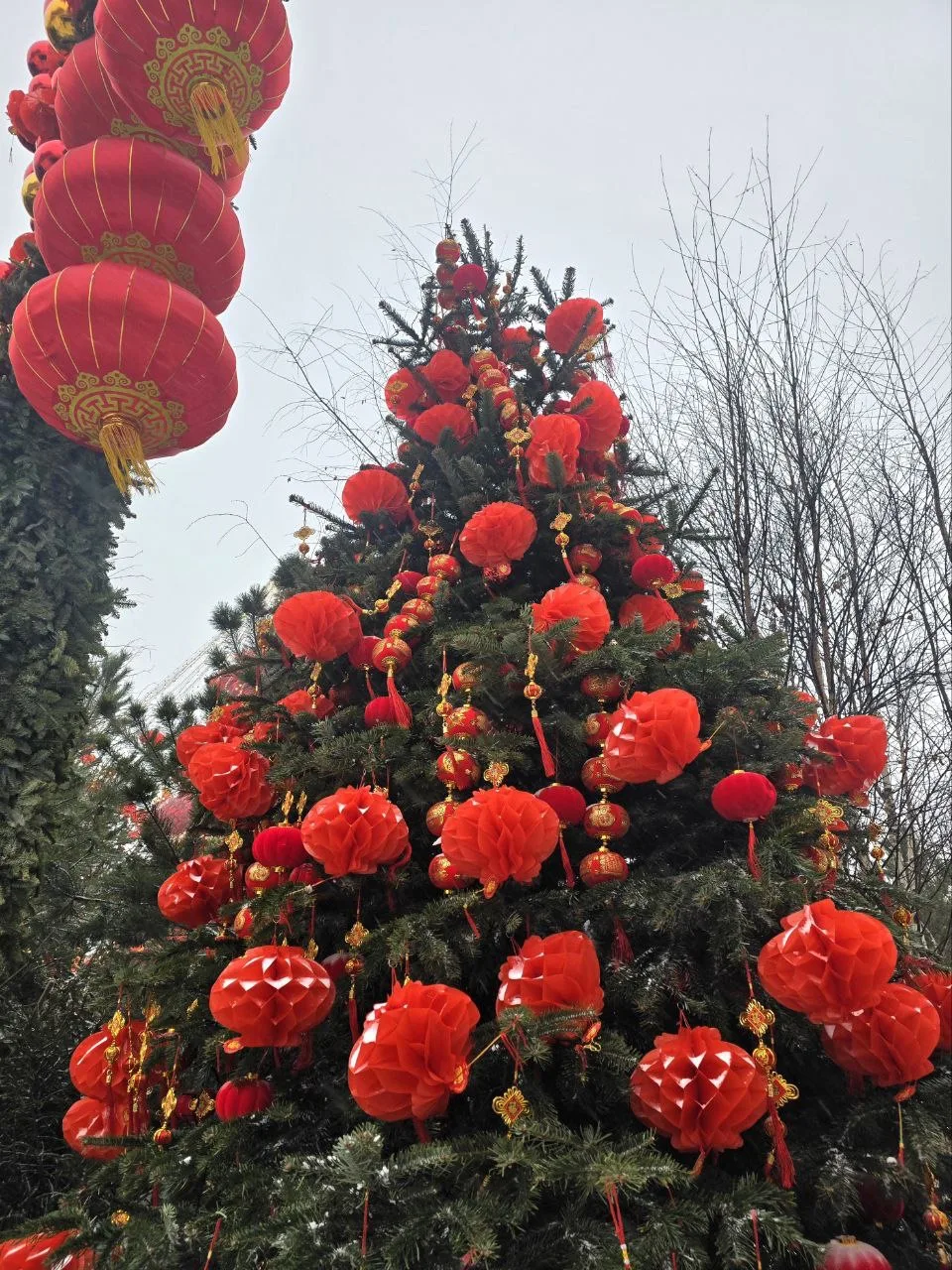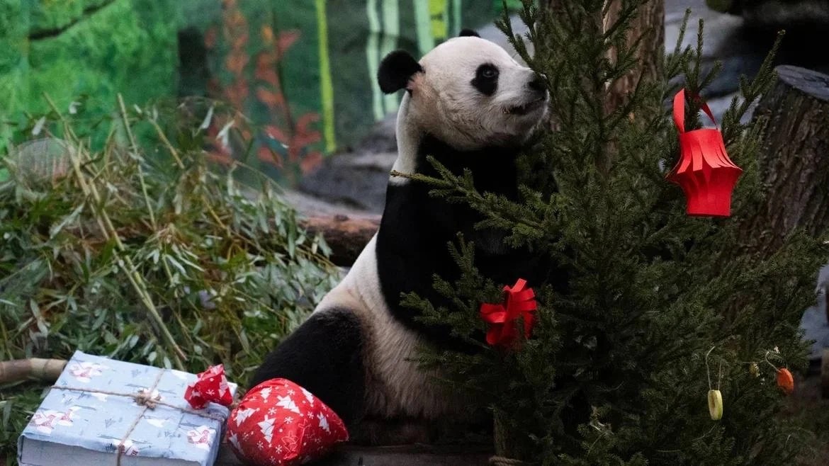 В центре установлена ёлка, которую обвивает огромный дракон. На дереве можно увидеть фонарики, подвески с кисточками, вееры, красные шары. А неподалёку расположились панды с мандаринами 🐼