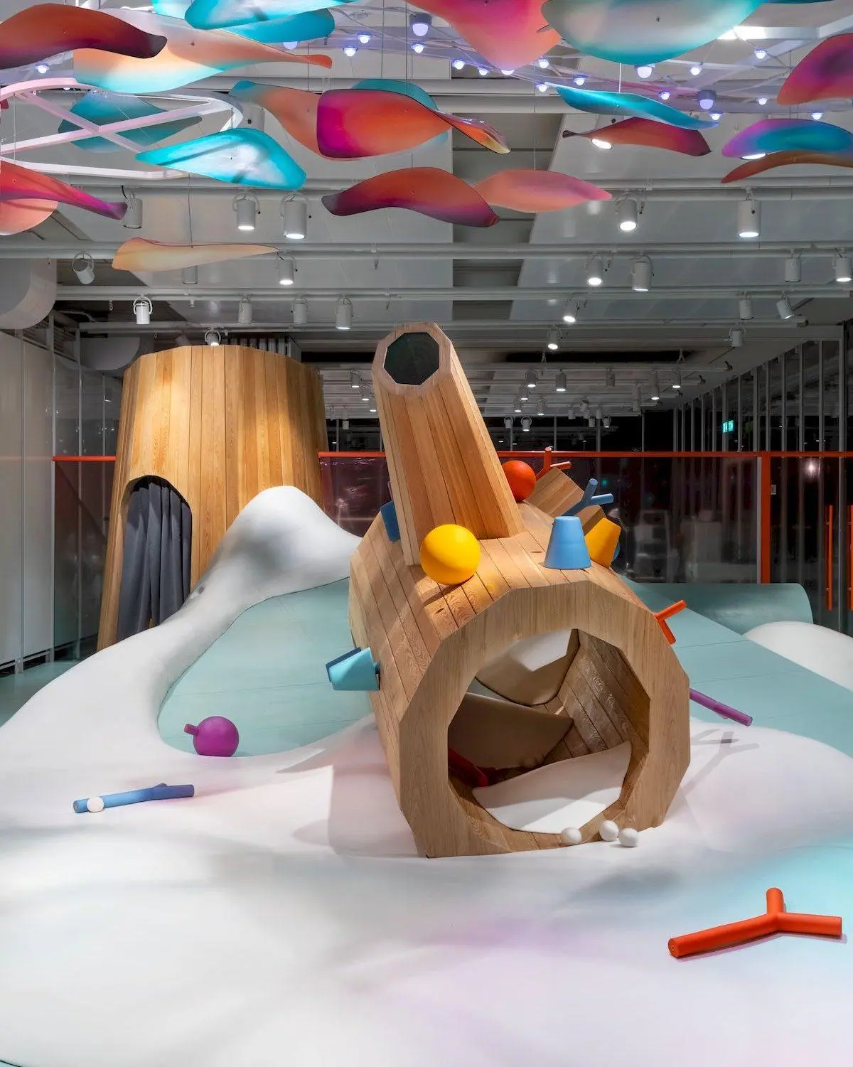 На первом этаже Дома культуры «ГЭС-2» расположена игровая зона для детей, оформленная в тематике «Алисы в Стране чудес». Здесь малыши могут пролезть через древесный ствол, спрятаться в звездном тоннеле или поиграть в мягком сугробе.