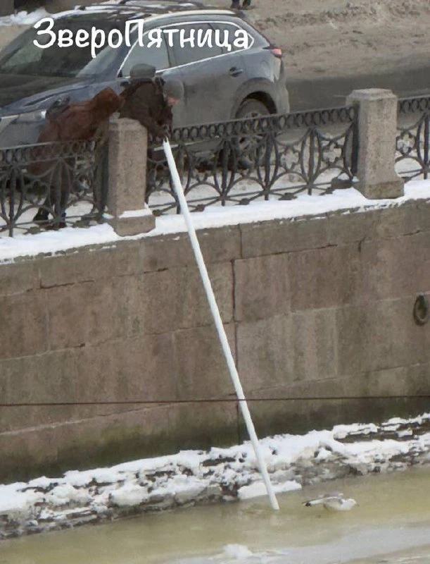 На Мойке неравнодушные петербуржцы спасли чайку, которая вмёрзла в лёд.