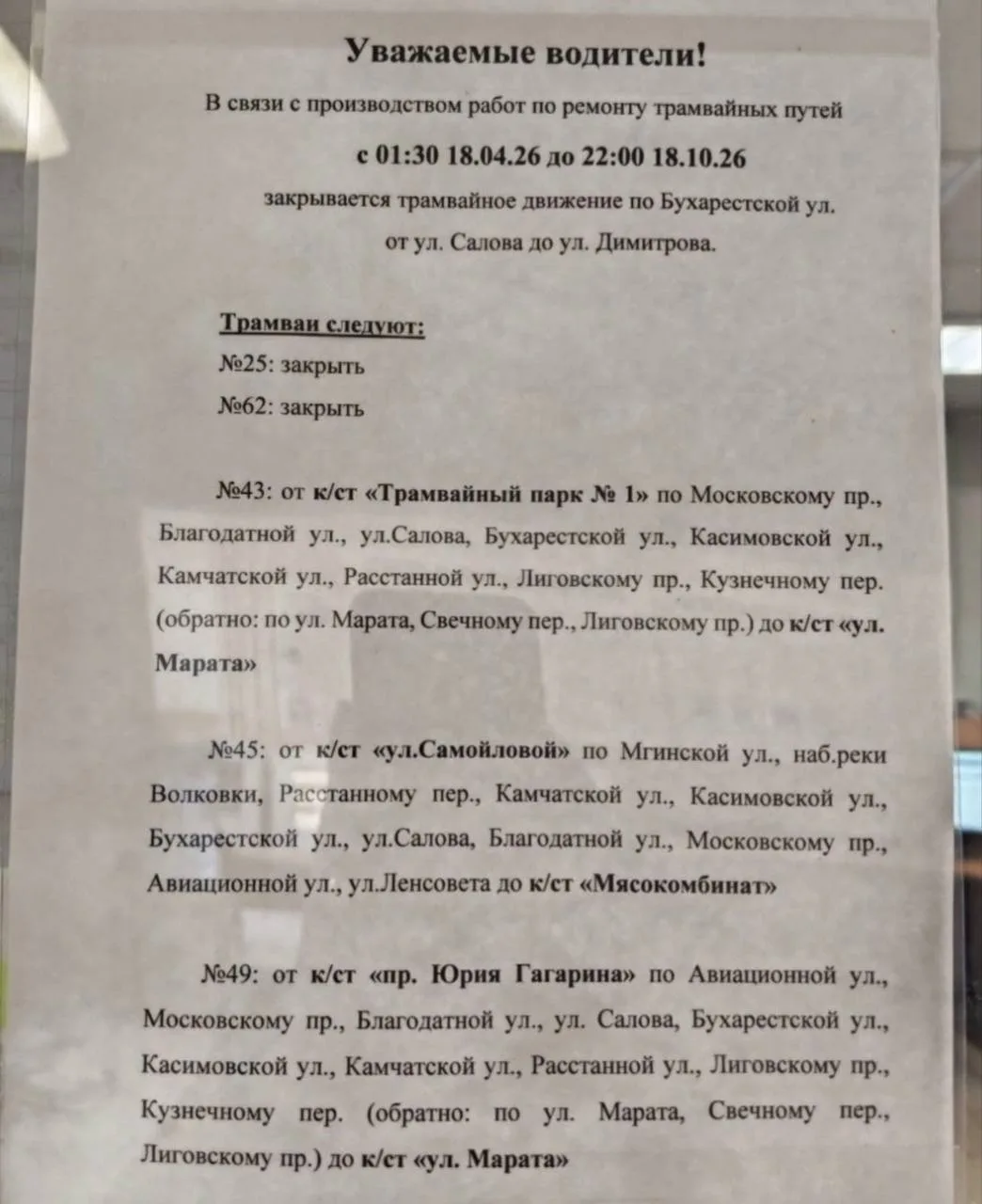 С 18 апреля по 18 октября часть маршрутов временно отменят, а другие будут ходить по изменённым трассам. Это связано с ремонтом путей на Бухарестской улице — на участке от улицы Салова до улицы Димитрова.
