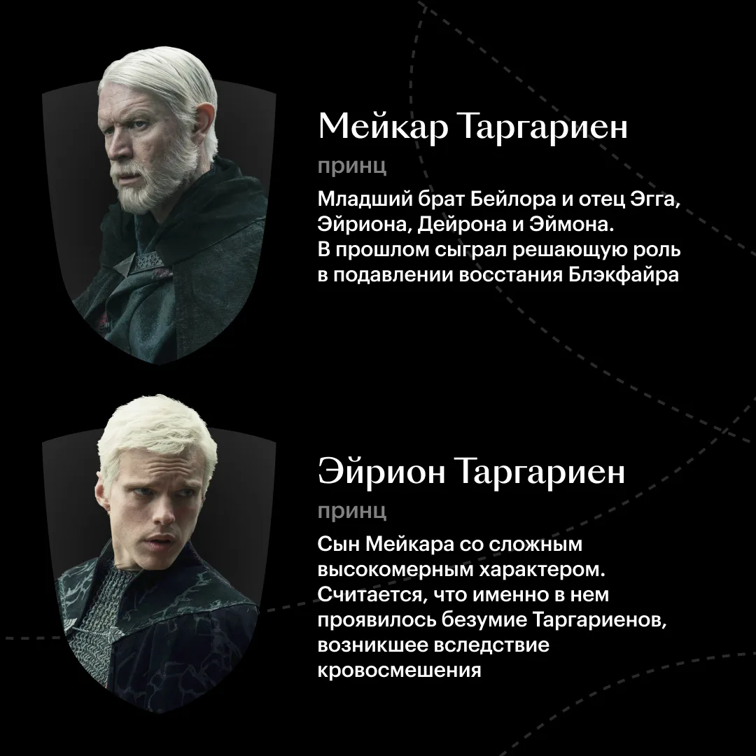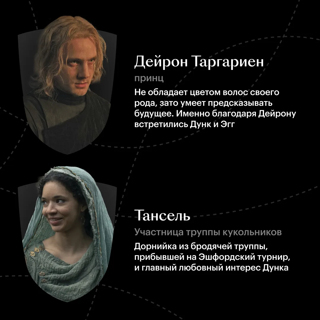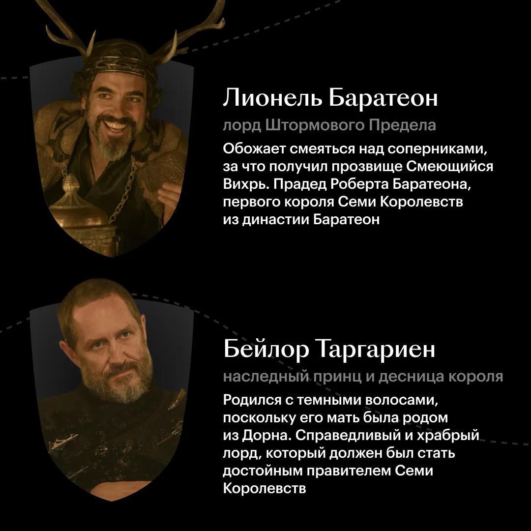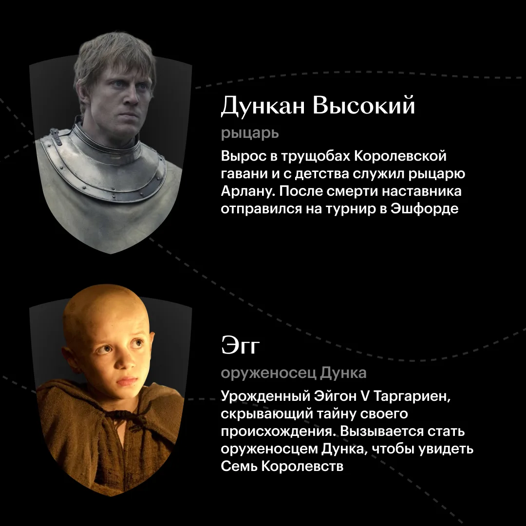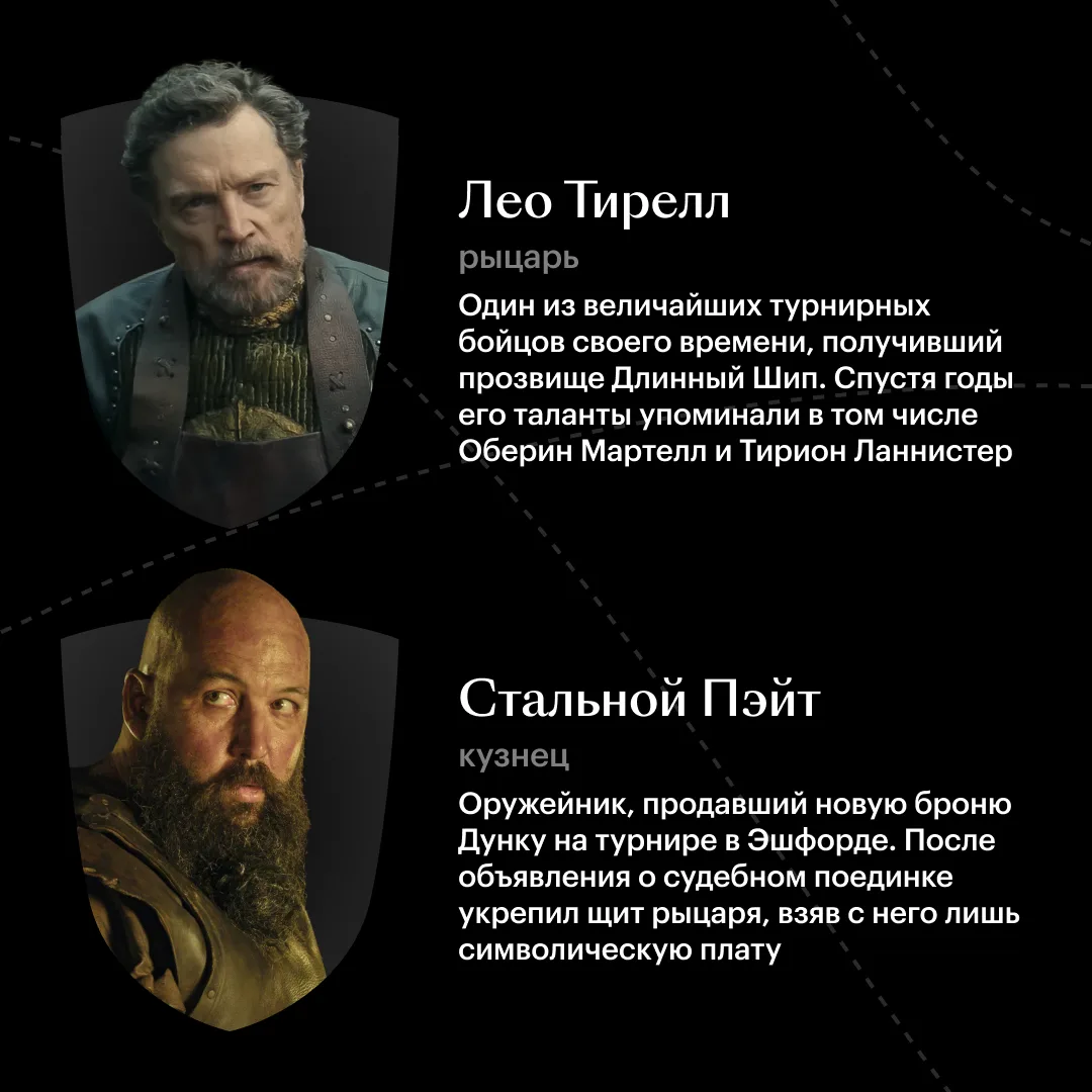 В нем сражалось больше дюжины рыцарей, и чтобы разобраться в них и других героях сериала, мы сделали карточки.