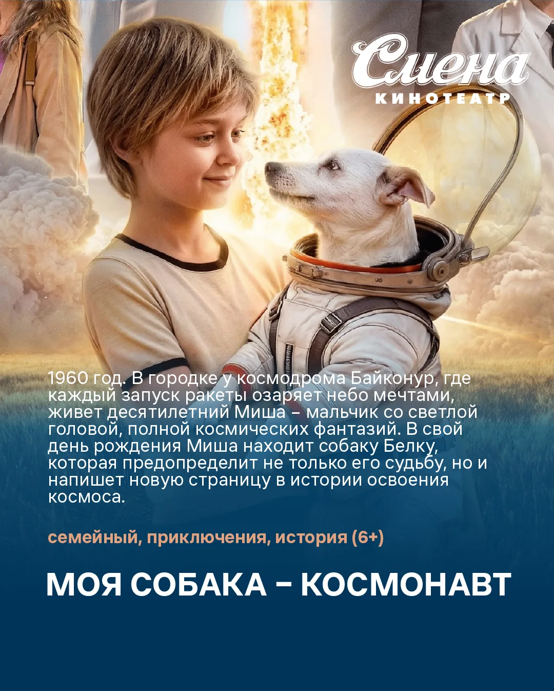 — фильм про Белку и Стрелку — собак, совершивших первый успешный полёт в космос, с 9 апреля в Смене и Дружбе