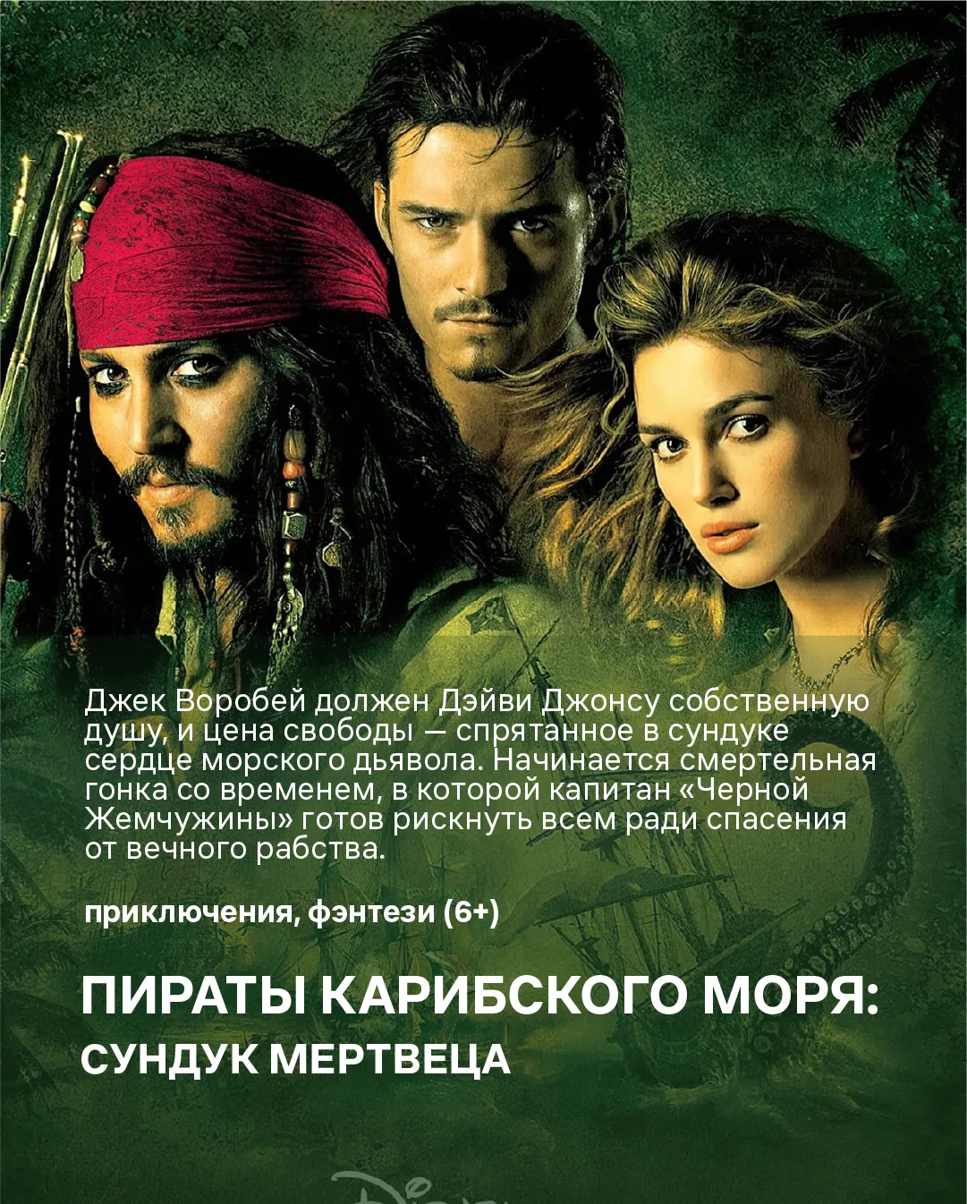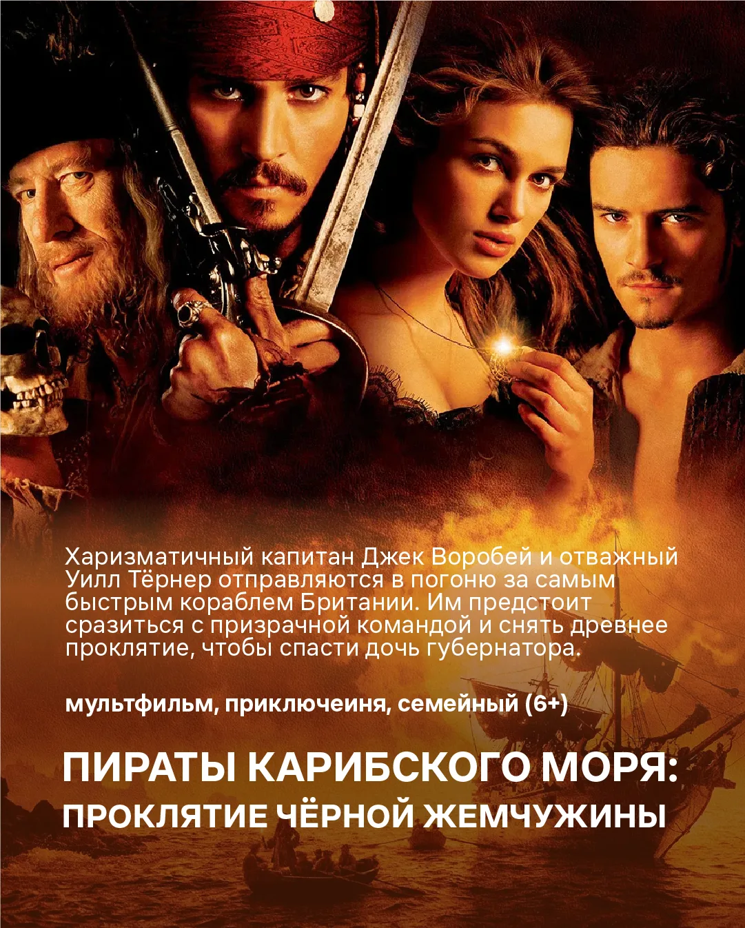 «Пираты Карибского моря: Проклятие Черной жемчужины» (6+): Легендарное приключение капитана Джека Воробья и Уилла Тёрнера против призрачной команды.