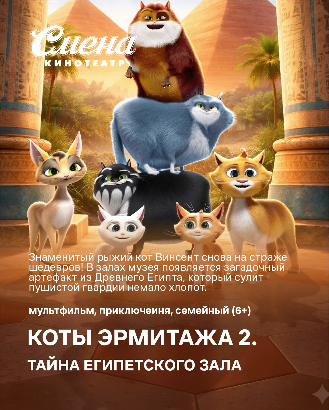 🐾 КОТЫ ЭРМИТАЖА 2: ТАЙНА ЕГИПЕТСКОГО ЗАЛА (6+) - Знаменитый рыжий кот Винсент снова на страже шедевров! В залах музея появляется загадочный артефакт из Древнего Египта, который сулит пушистой гвардии немало хлопот.