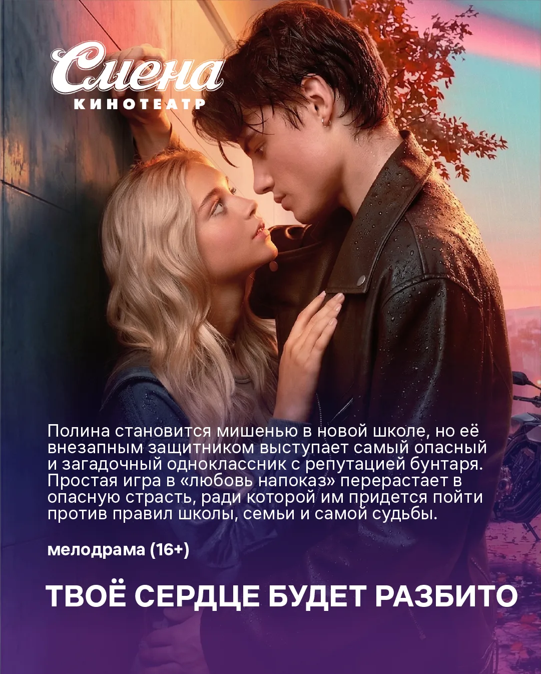 «Твоё сердце будет разбито» (16+): Мелодрама о школьной любви между "новенькой" и "бунтарем" школы, ради которой им придется пойти против правил.