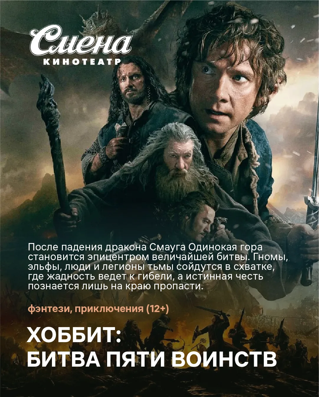 ⚔️ ХОББИТ: БИТВА ПЯТИ ВОИНСТВ (12+) - Решающая схватка за Эребор начинается! Огромные армии сходятся у Одинокой горы, а судьба Средиземья теперь зависит от мужества маленького хоббита.
