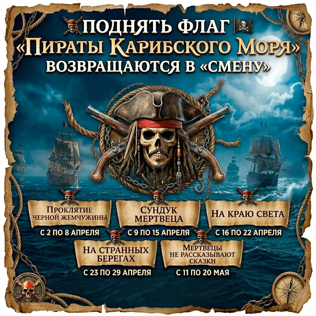 От таинственных пещер Исла-де-Муэрта до самого Края Света - пройдите этот путь вместе с самым неуловимым капитаном в истории кино. Марафон всех пяти частей саги начинается в «Смене».