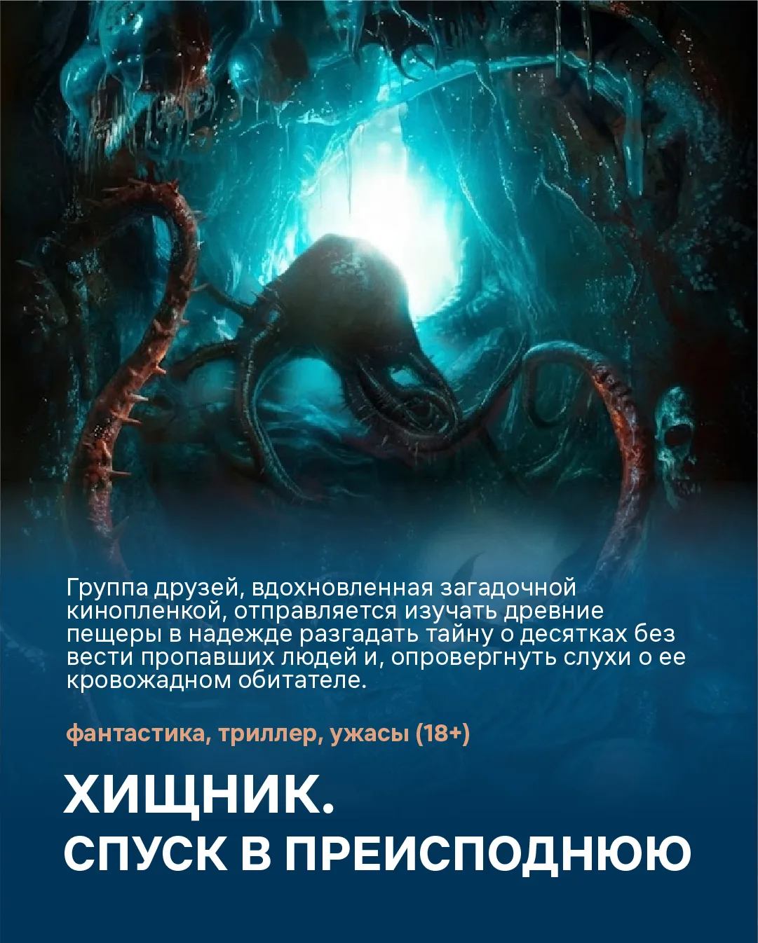 «Хищник. Спуск в преисподнюю» (18+): Группа друзей исследуя древние пещеры столкнуться лицом к лицу с кровожадным обитателем недр.