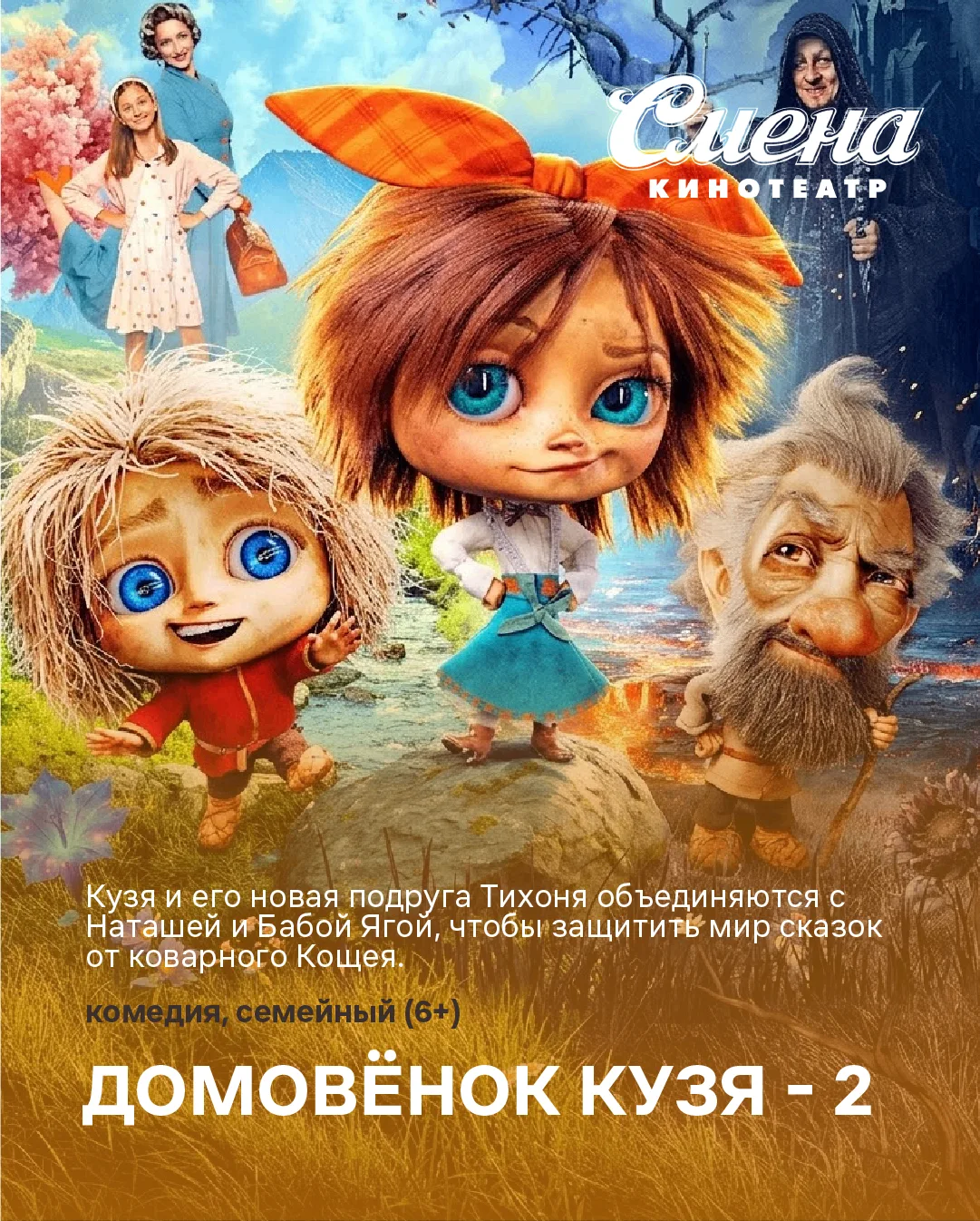 «Домовёнок Кузя 2» (6+): Кузя и его подруга Тихоня объединяются с Бабой Ягой и Наташей, чтобы защитить мир сказок от козней Кощея.