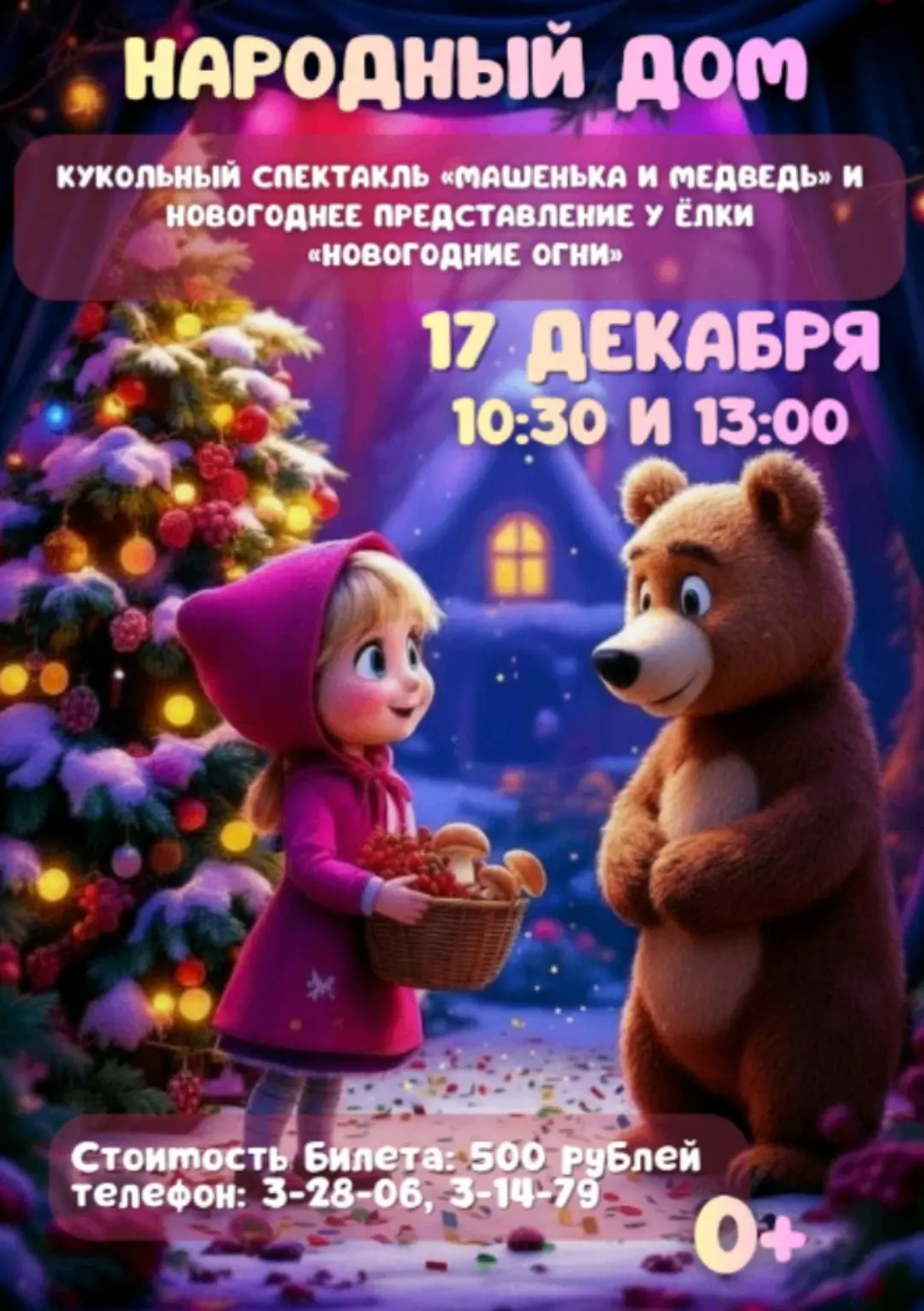 17 декабря в 10:30 и 13:00 состоятся показы кукольного спектакля «Машенька и медведь» (0+) и новогоднего театрализованного представления«Новогодние огни» ( 0+) от Вологодского областного театра кукол «Теремок».