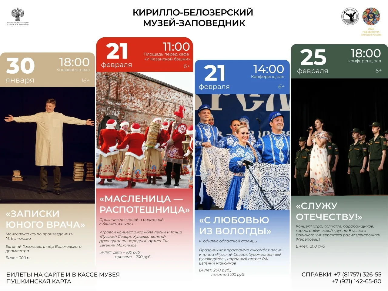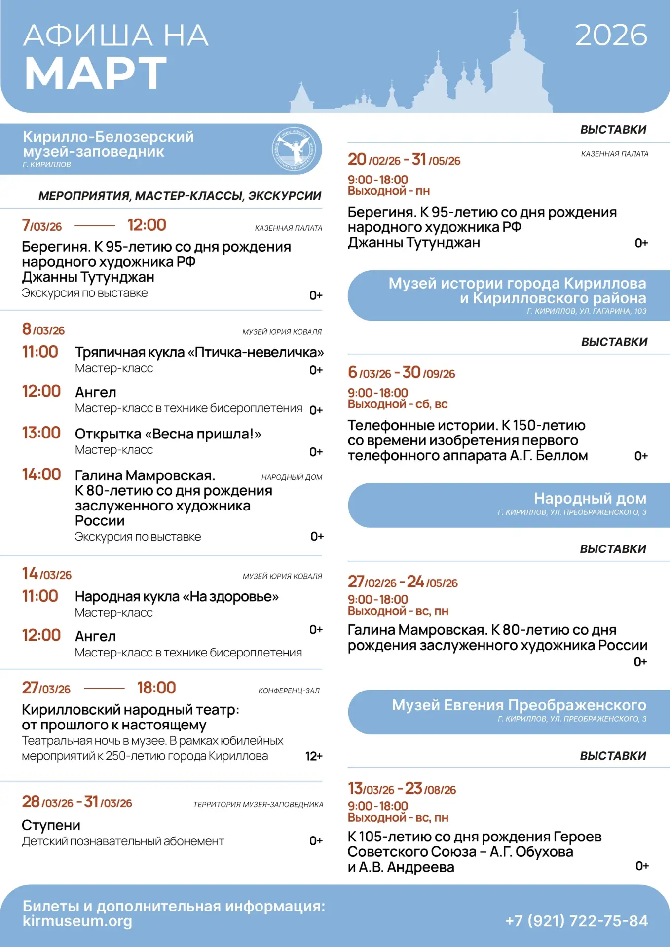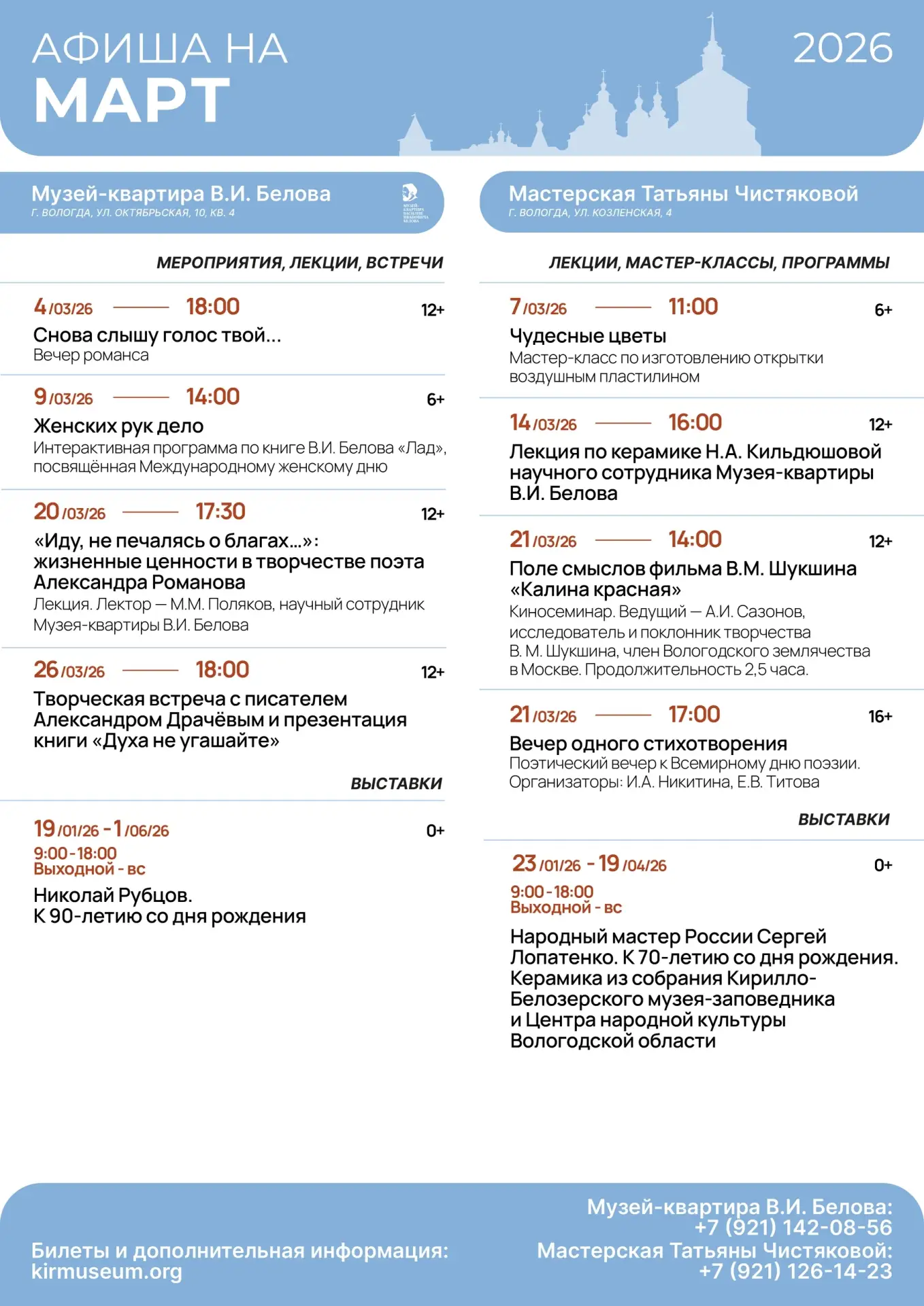 Дорогие друзья! Напоминаем: для вас мы подготовили сводную афишу мероприятий и выставочных проектов Кирилло-Белозерского музея-заповедника и филиалов на март 2026 года.