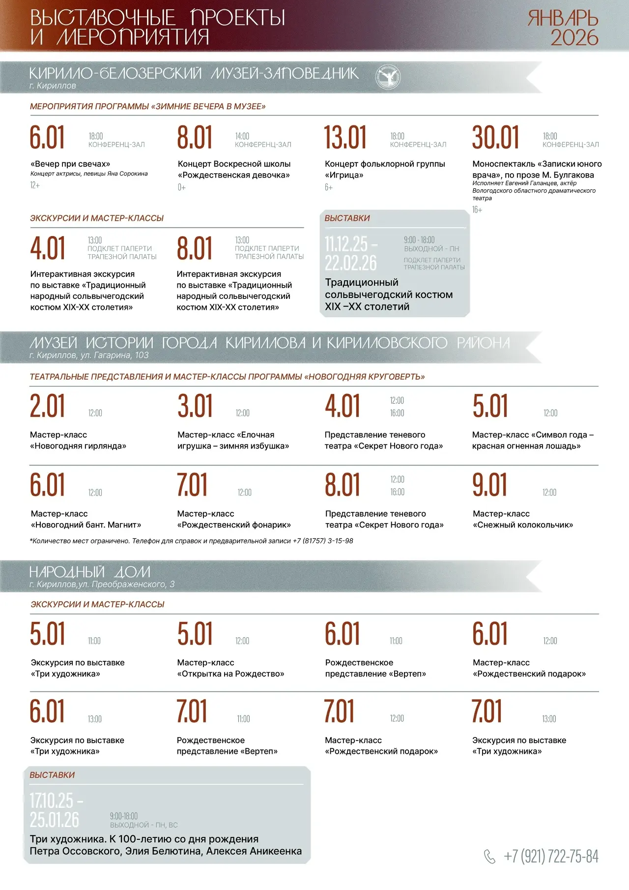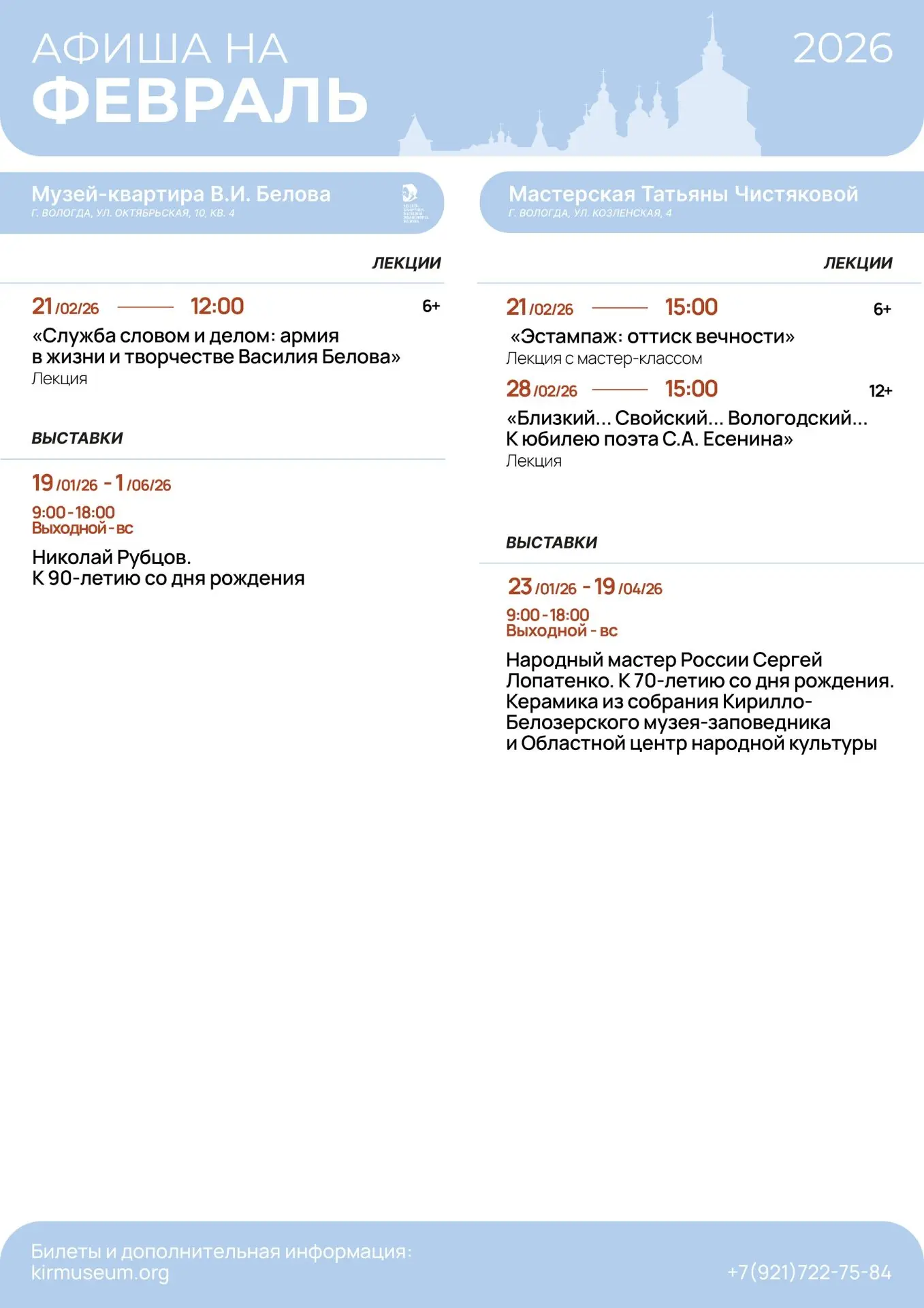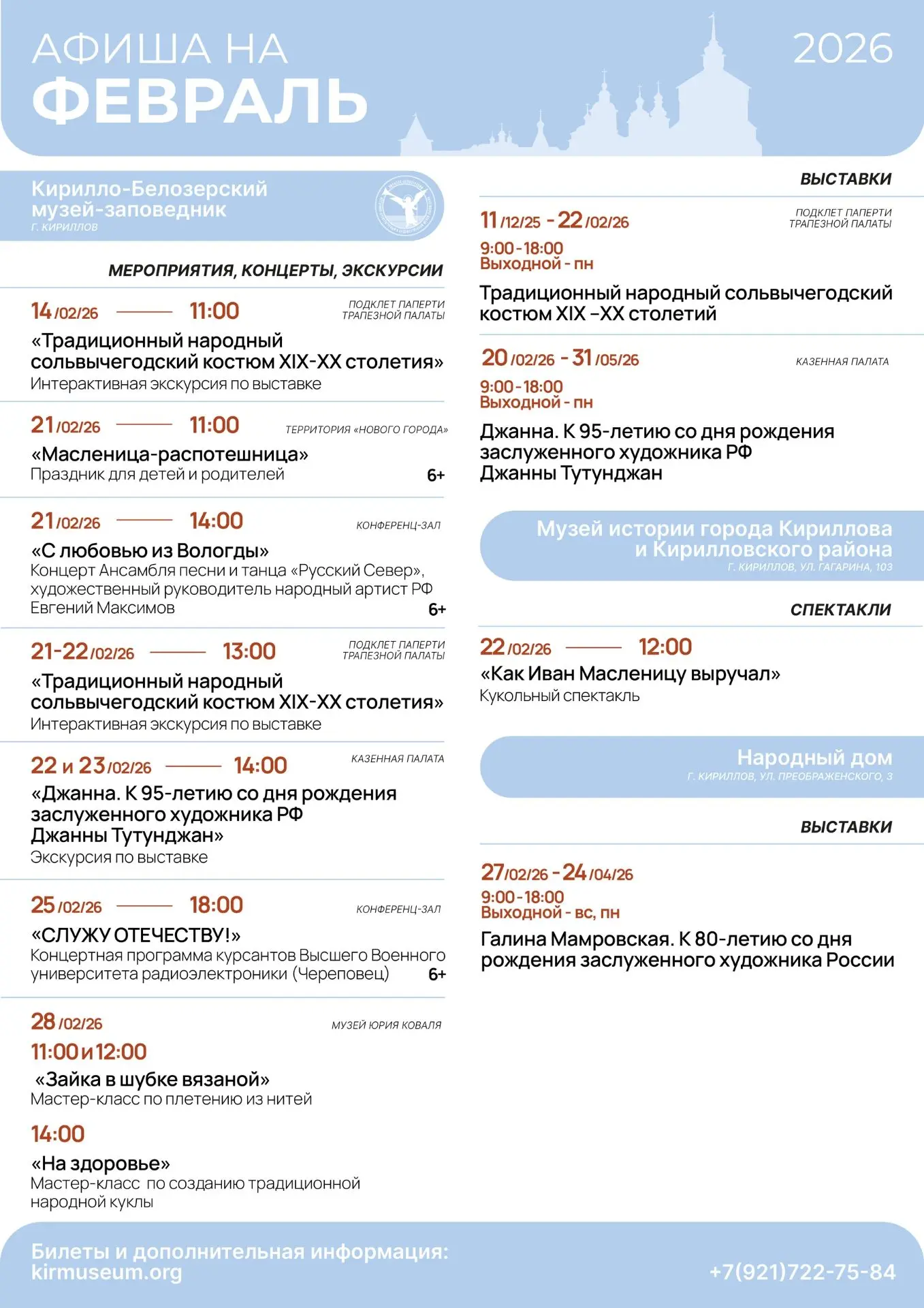 Дорогие друзья! Напоминаем: для вас мы подготовили сводную афишу мероприятий и выставочных проектов Кирилло-Белозерского музея-заповедника и филиалов на март 2026 года.