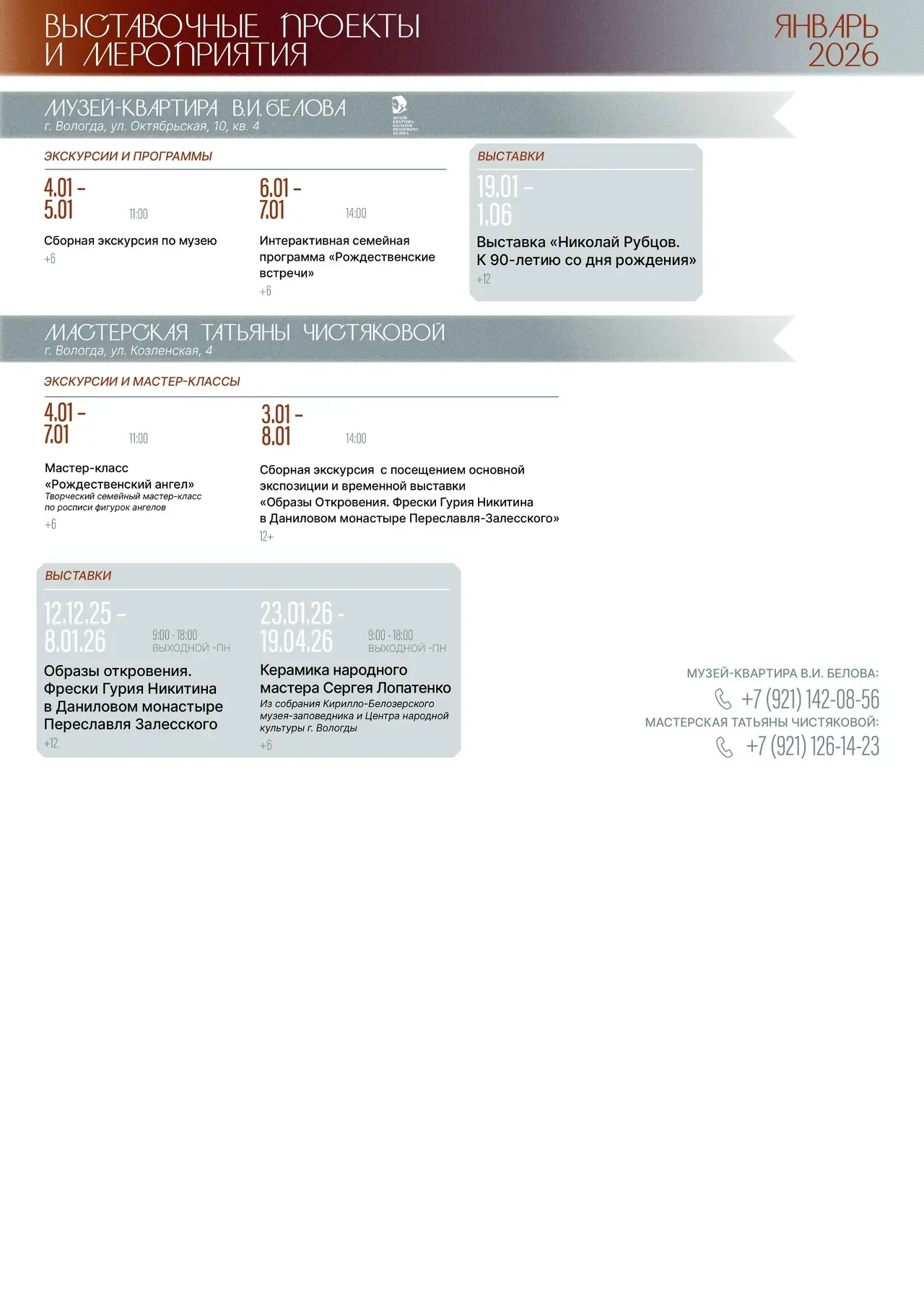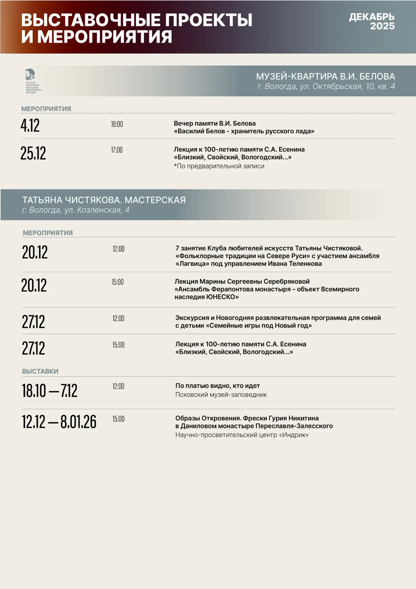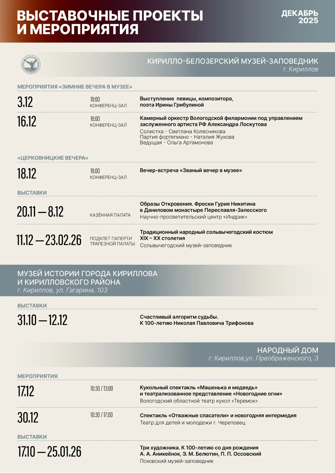 Дорогие друзья! Предлагаем Вашему вниманию сводную таблицу выставочных проектов и мероприятий Кирилло-Белозерского музея-заповедника на декабрь 2025 года!