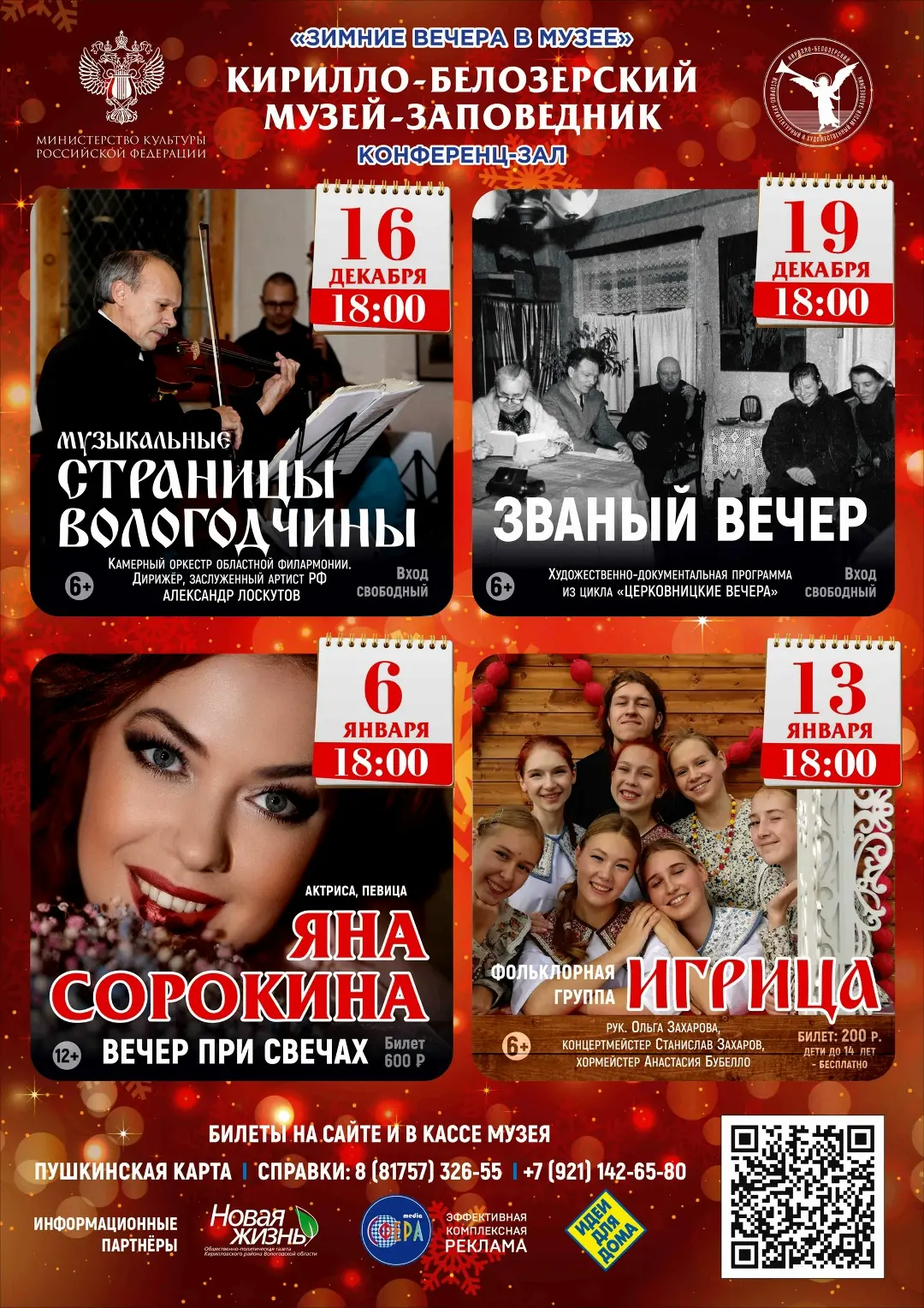«Зимние вечера в музее» станут еще одной точкой притяжения туристов на Русском Севере. Здесь, в центре православной обители, гости смогут насладиться не только историей и архитектурой монастырского комплекса, но и приобщиться к театральному и концертному искусству, – заверяет генеральный директор Кирилло-Белозерского музея-заповедника Юлия Веретнова. – Посетители музея встретятся с известной российской певицей, поэтом и композитором Ириной Грибулиной, насладятся «Музыкальными страницами Вологодчины» в исполнении Камерного оркестра областной филармонии под управлением дирижера – Заслуженного артиста России Александра Лоскутова, побывают на концерте вокального ансамбля «Аксиос», участники которого регулярно совершают Богослужения в храмах Вологодской митрополии и в составе архиерейского хора. В завершение программы участников «Зимних вечеров в музее» ждут «Церковницкие вечера» и встреча с вологодской актрисой и певицей Яной Сорокиной».