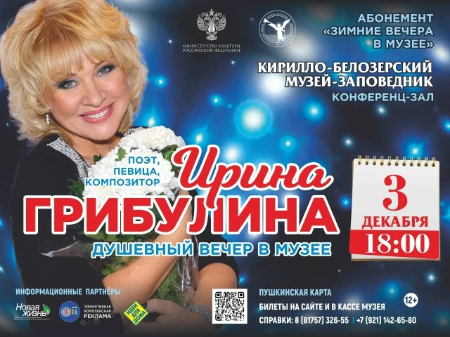 Третьего декабря с творческим вечером (12+) в Кирилло-Белозерском музее-заповеднике выступит Ирина Грибулина!