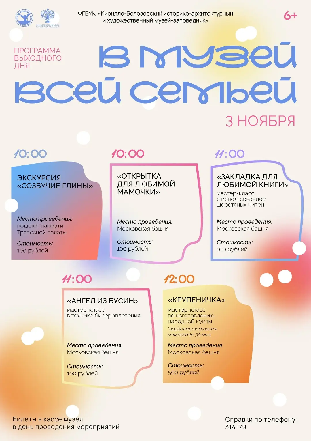«Ночь искусств» в Кирилло-Белозерском музее-заповеднике продолжится программой выходного дня «В музей всей семьей» (12+). Участников акции ждет прогулка по территории крупнейшего православного монастыря, экскурсия по выставке современного керамического искусства «Созвучие глины», а также серия мастер-классов по изготовлению народной куклы «Крупеничка», ангела из бусин, открыток и закладок с использованием шерстяных нитей.