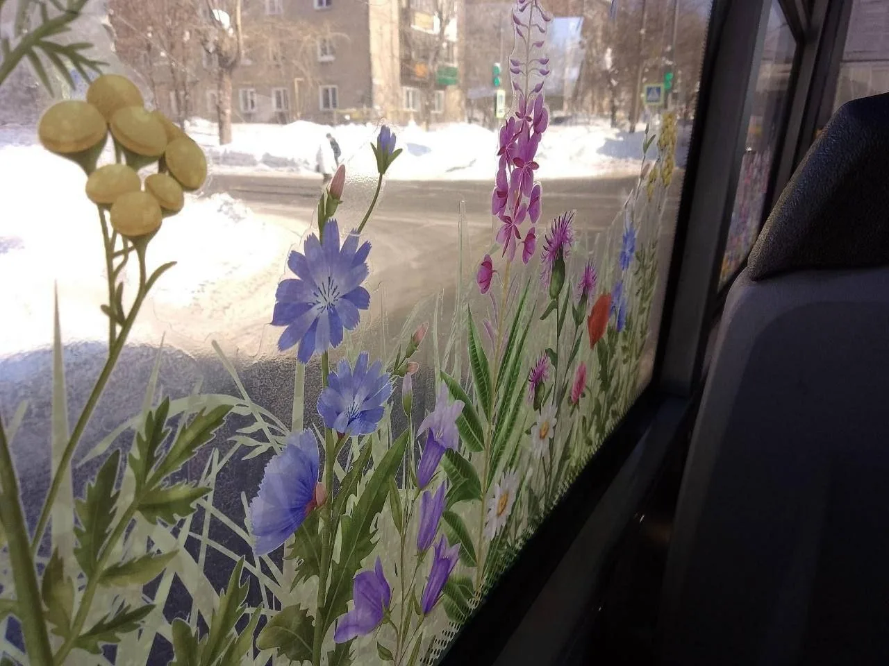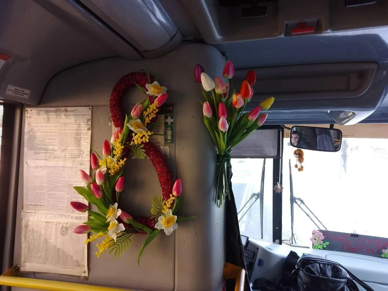 В преддверии Международного женского дня в Слободском празднично оформили салон автобуса, следующего по маршруту №2. Салон превратился в весеннюю инсталляцию: стены украсили цветами, бабочками и изображением жар-птицы, а центральным элементом стала яркая композиция из тюльпанов.