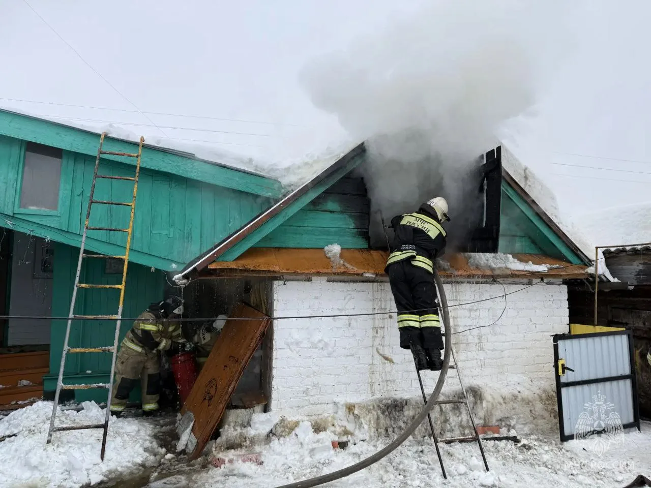 Огнем повреждено потолочное перекрытие и обрешетка крыши пристроя.
