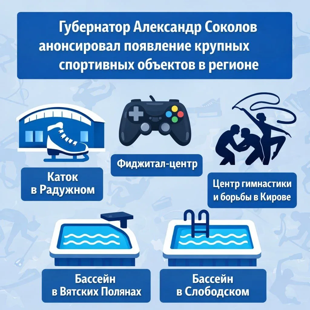 — В 2026 году должно быть завершено строительство крытого катка с искусственным льдом в микрорайоне Радужный города Кирова, фиджитал-центра в зоне перспективной застройки университетского кампуса, должен быть открыт бассейн в Вятских Полянах, начато строительство бассейна в Слободском, начато строительство Центра художественной гимнастики и спортивной борьбы в Кирове, — рассказал Александр Соколов.