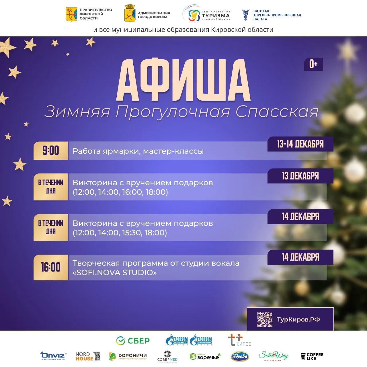 В субботу 13 декабря, в 12:00, 14:00, 16:00 и 18:00 на площадке у Дома Витберга пройдут викторины на знание достопримечательностей Кировской области и новогодних традиций с вручением сувениров за правильные ответы.