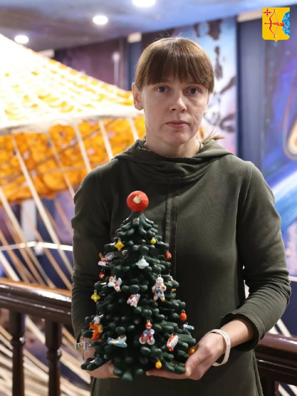 На её космической ёлочке можно увидеть образы Циолковского, Гагарина, Леонова, Терешковой, Белки и Стрелки, а также нашего земляка Виктора Савиных. Среди ветвей разместились первый спутник, корабль «Союз», луноход и станция «Салют», а верхушку венчает не звезда, а огненное Солнце.