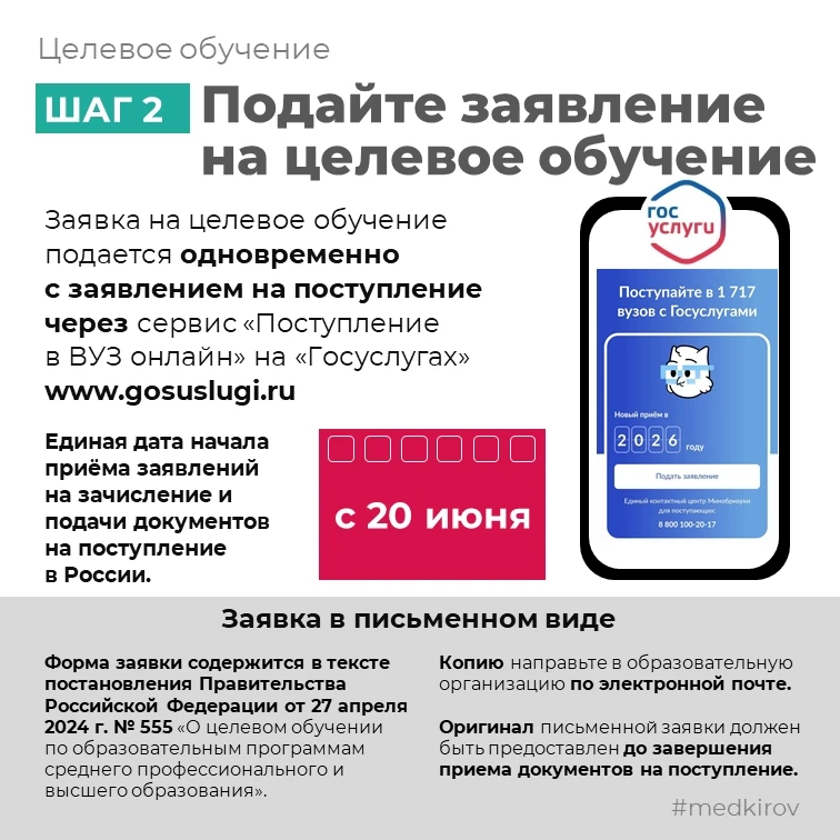Медицинские организации формируют на портале «Работа России» предложения о заключении договоров о целевом обучении, а абитуриенты подают заявки на заключение договора. Сам договор о целевом обучении заключается после опубликования списков поступивших. Предложения по каждой медицинской организации будут опубликованы на портале до 10 июня.