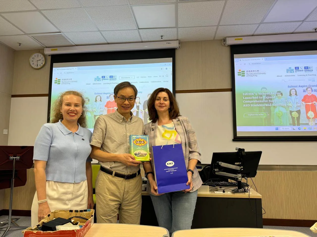 Помимо знакомства с образовательными и научными организациями принимающей страны, доценты факультета ПиП КИУ имени В.Г. Тимирясова Ванюхина Н.В. и Филатова-Сафронова М.А. осуществляли просветительскую и амбассадорскую миссию - знакомили преподавателей и студентов Гонконга с деятельностью российских сообществ «Знание», «Лига преподавателей высшей школы» и нашего университета.