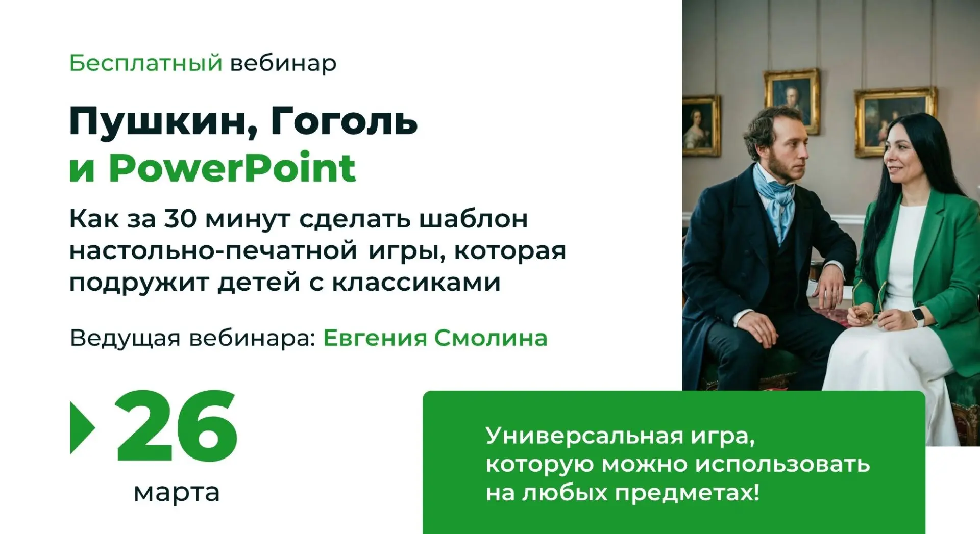 БЕСПЛАТНЫЙ ВЕБИНАР «Пушкин, Гоголь и PowerPoint: как за 30 минут создать шаблон настольно-печатной игры, которая подружит детей с классиками и не только..."