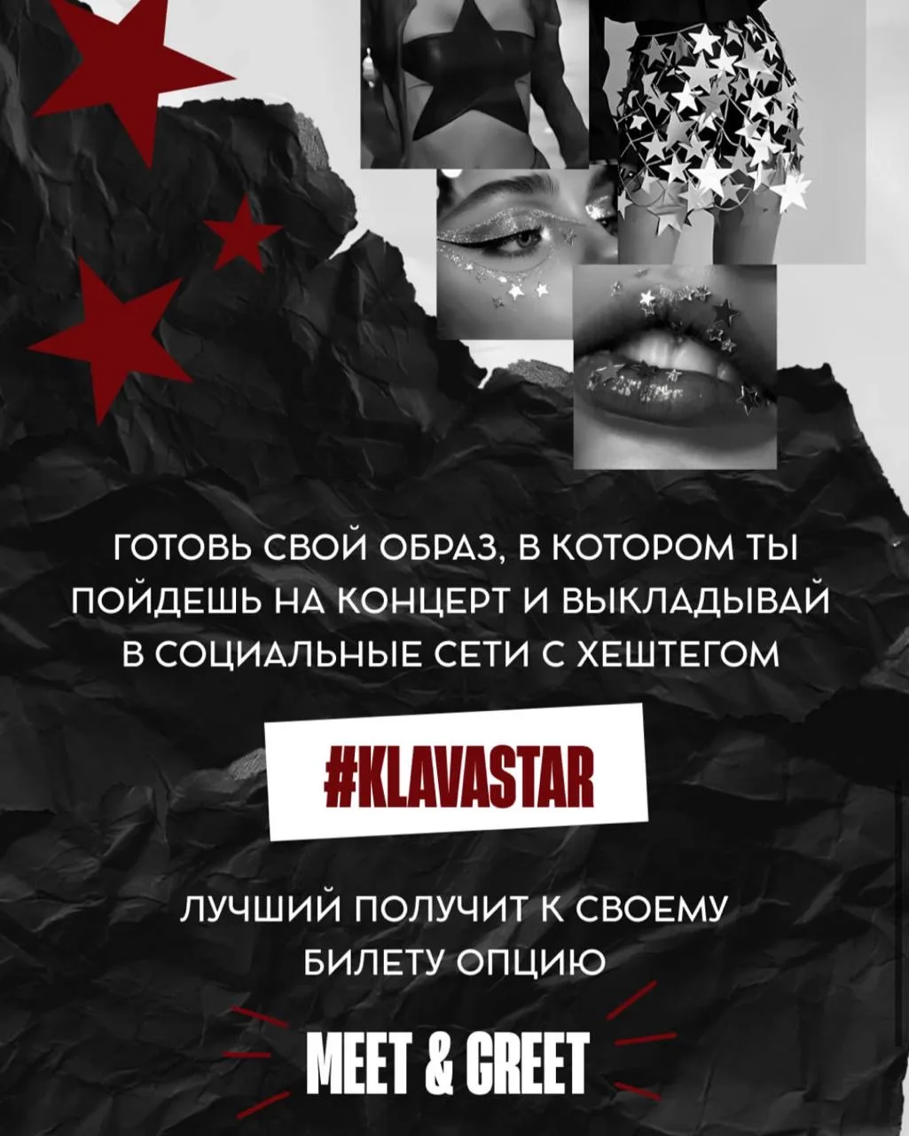 Выкладывайте подготовку ваших образов по хэштегу #KLAVASTAR во всех соцсетях!!! И самый крутой получит upgrade билета до meet&greet (осталось всего 4)