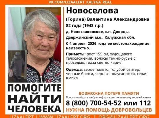 Об этом сообщили волонтёры поисково-спасательного отряда «ЛизаАлерт Калуга». С четвертого апреля о местонахождении Валентины Александровны Новосёловой (Гориной) из деревни Новоскаковское Дзержинского округа ничего не известно.