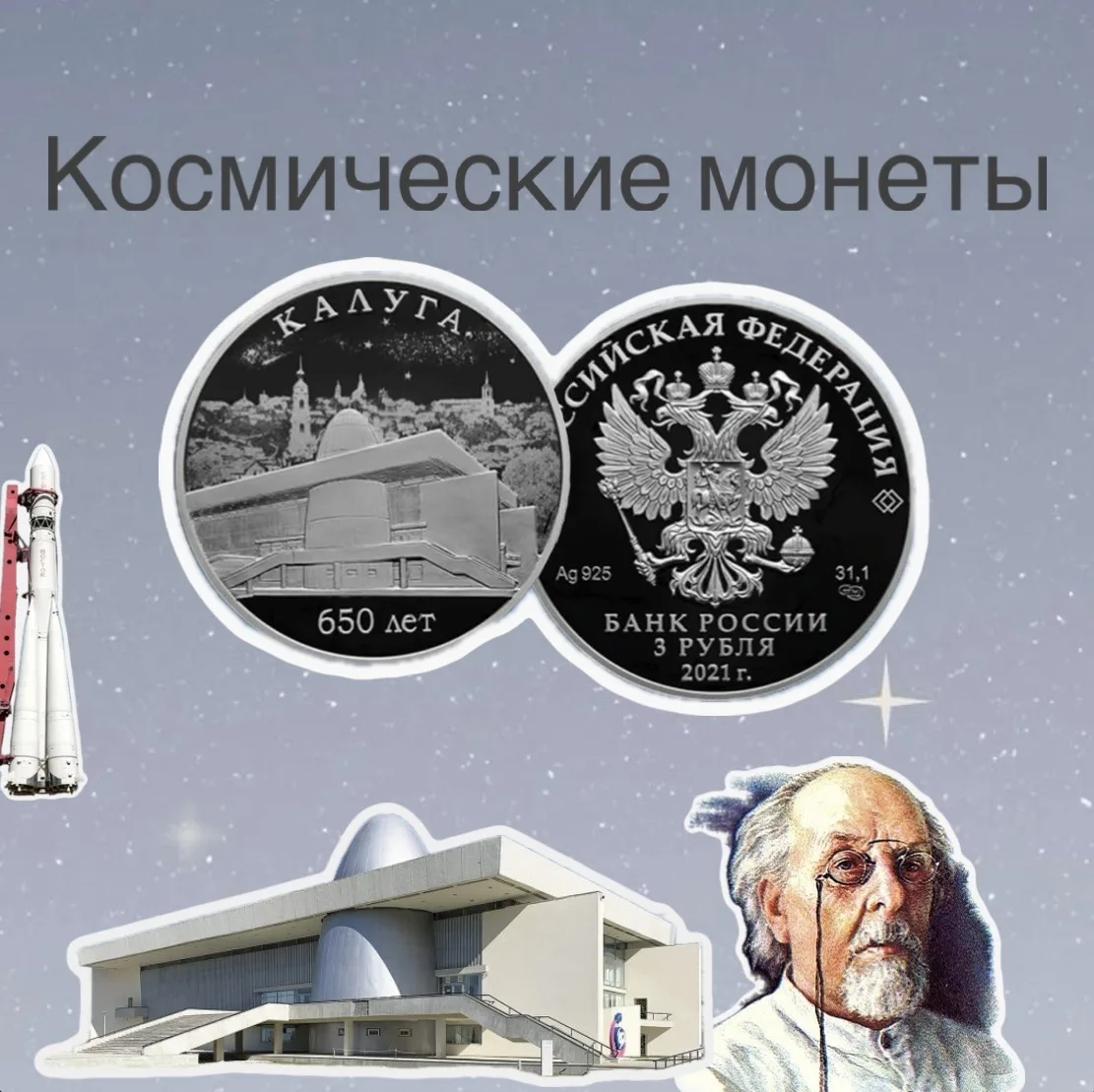 Открывает подборку памятная монета серии «Города», посвященная 650-летию основания Калуги. На ней запечатлён наш Музей космонавтики — самый крупный музей России по космической тематике.