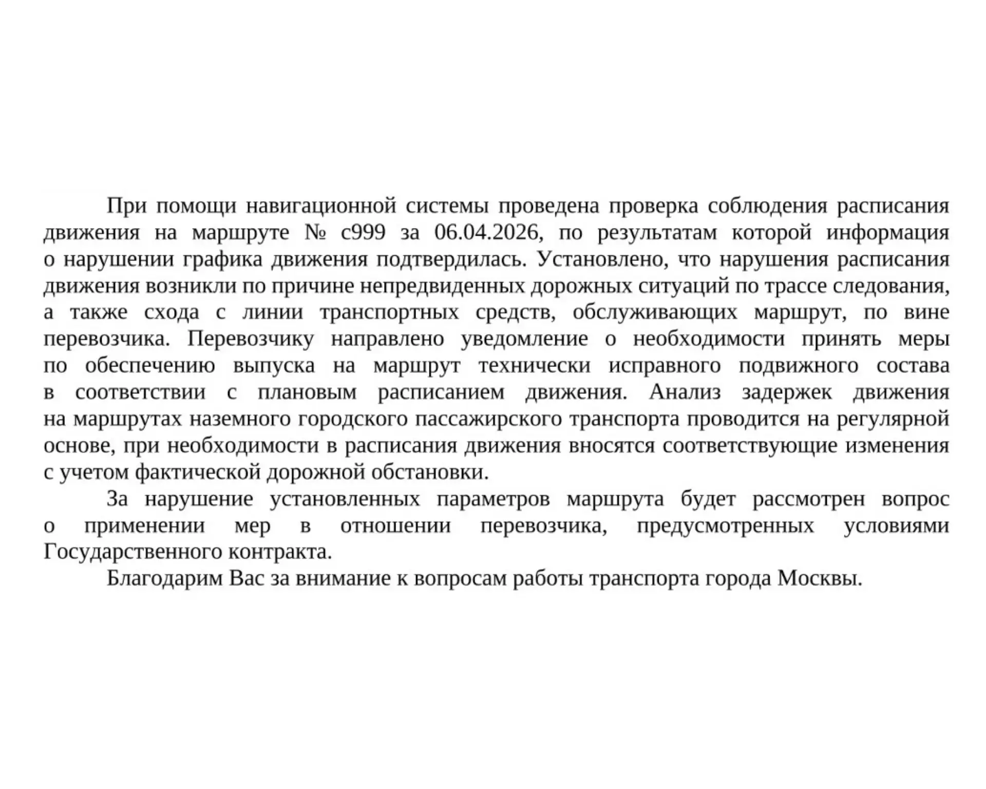 В результате проверки маршрута с999 от 06.04.2026 выявлены нарушения в графике движения.