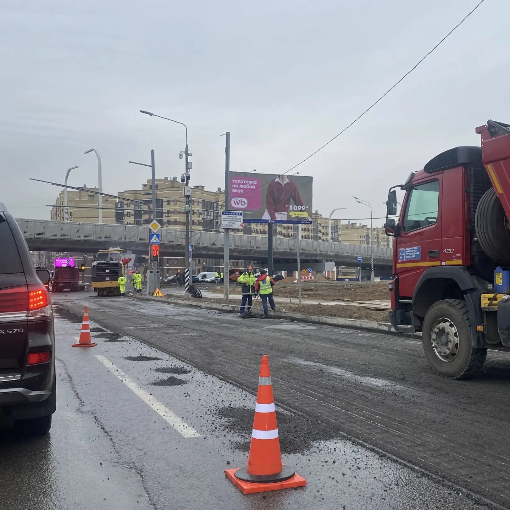 Уважаемые строители, нанесите уже разметку на дублере Коммунарского шоссе на пересечении с А.Монаховой,