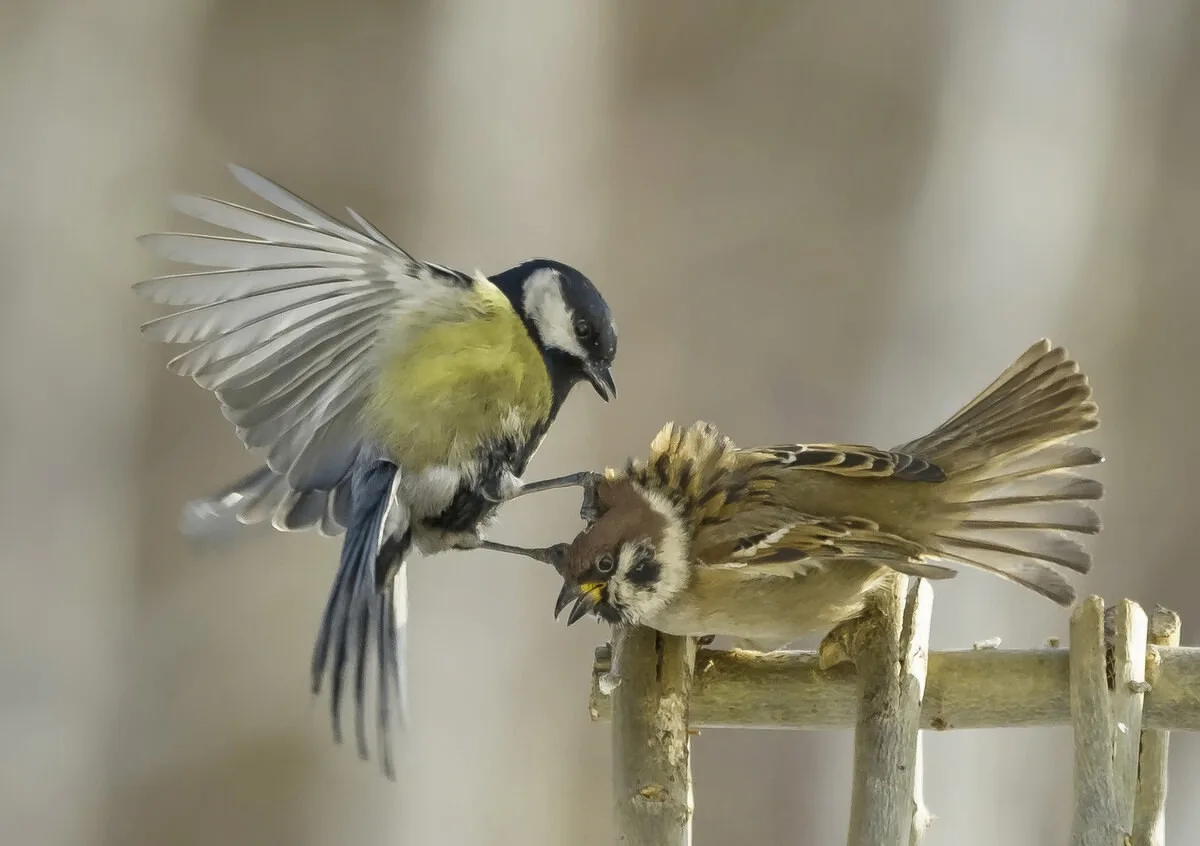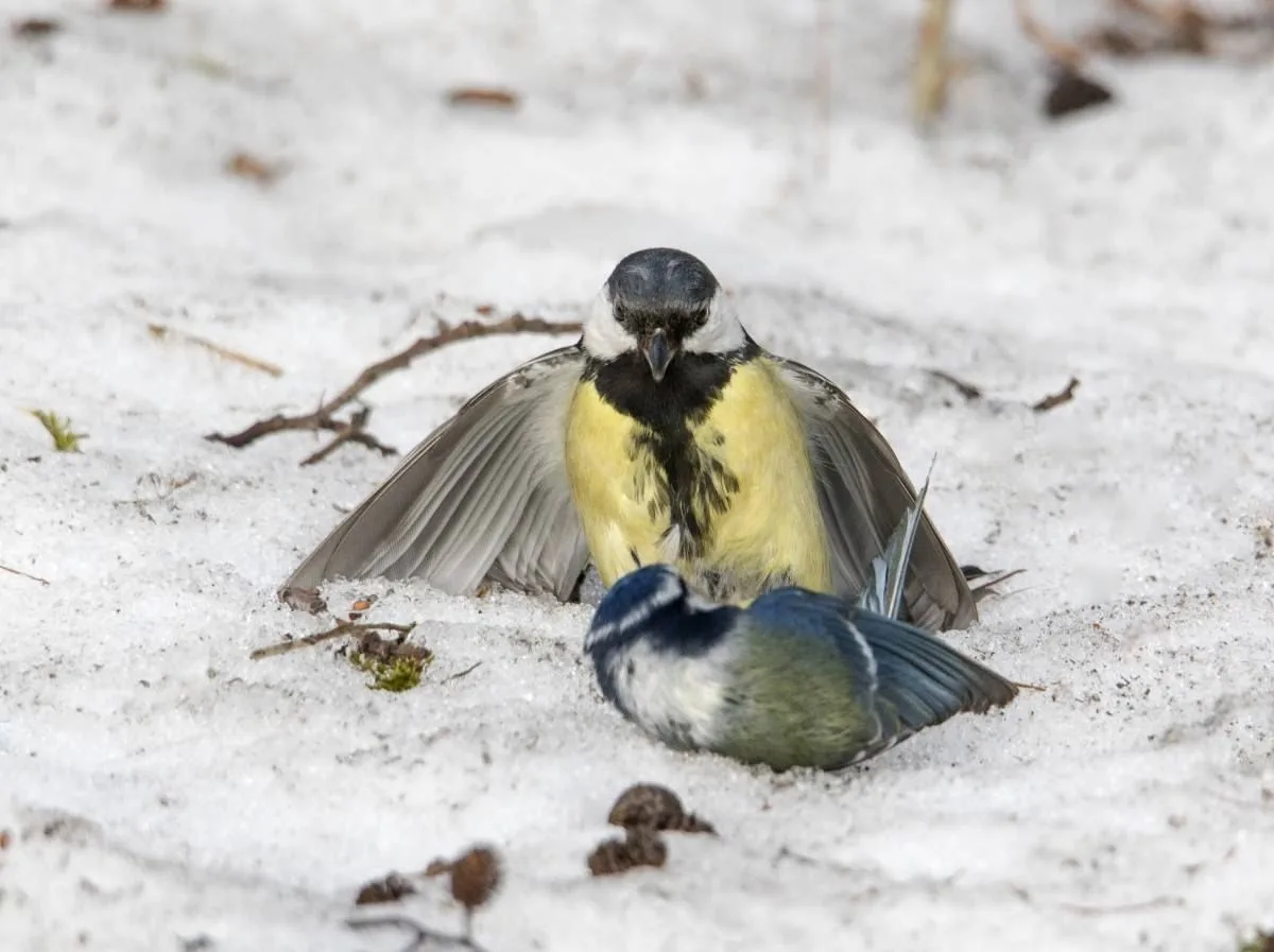Синицы — всеядные и очень прожорливые птахи, ведь у них быстрый метаболизм: температура птичек всегда держится на отметке в 42 С. Чтобы нормально функционировать, малыши должны кушать хотя бы каждые 40 минут. И если на всём вышеперечисленном растительно-подножном корме в тёплое время года ещё можно выжить, то зимой ситуация разворачивается критическая. Из-за голода и холода до весны доживут только 3-5 самых умных, сильных и злобных особей из 10. Всё потому, что они научатся убивать.
