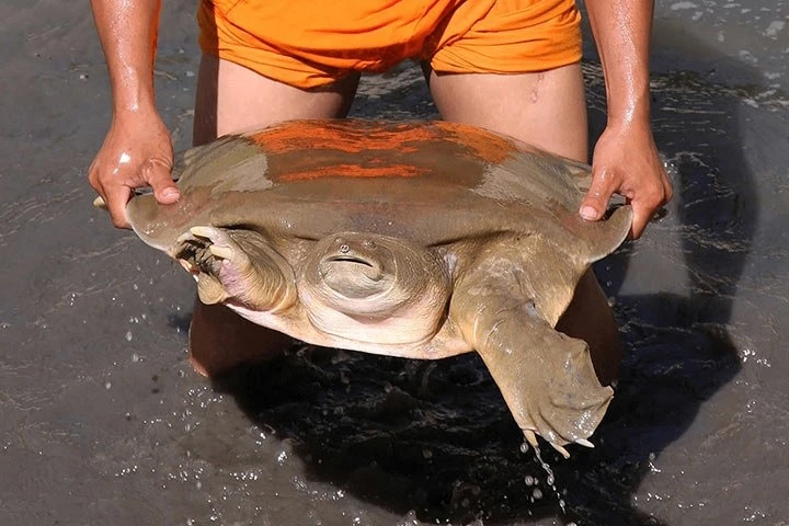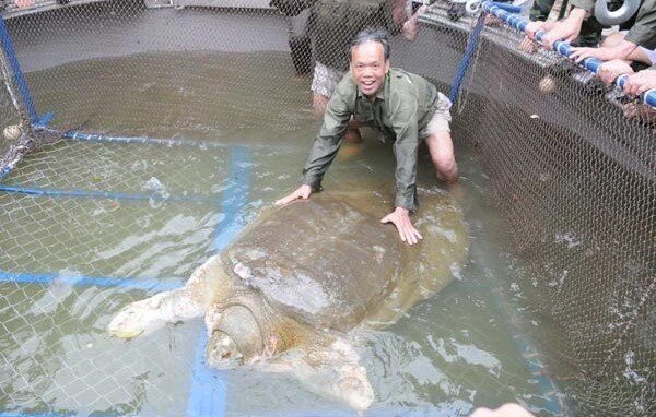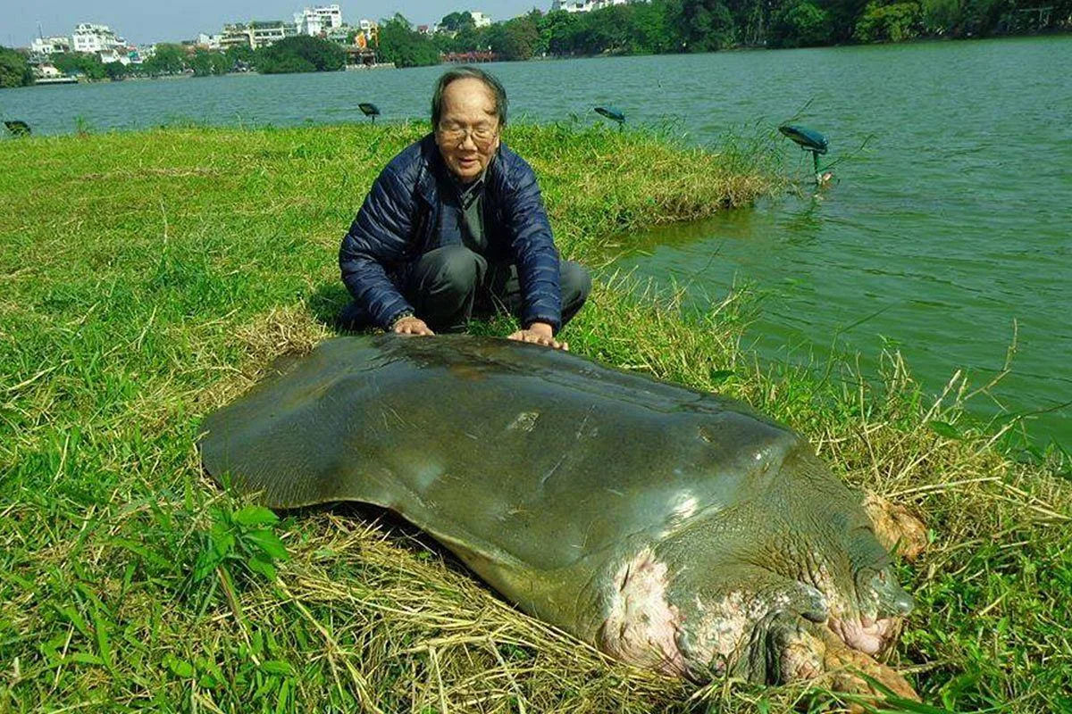 Эти редчайшие гиганты исследованы очень плохо. Да чего уж там, до 2003 года этот вид мягкотелов вообще считался вымершим! Но в 2007 на берегу Меконга обнаружили вполне себе жизнеспособную популяцию азиатских черепах. Эта находка вернула черепах к миру живых, но их популяция всё равно в критическом положении.