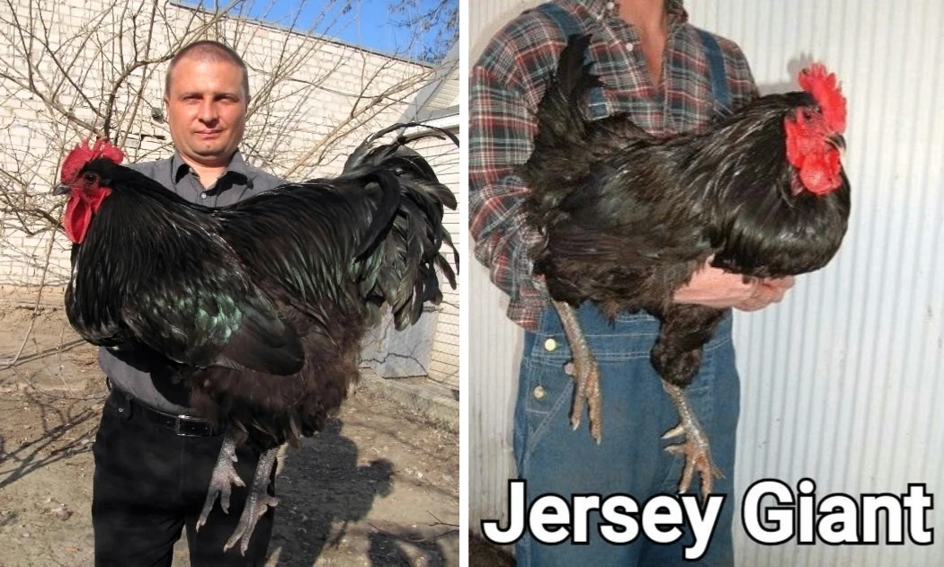 Джерсийский, или чёрный гигант — на вид птички довольно простенькие и даже грубоватые. У них всего 3 окраса: чёрный, белый и серый. Нет у них ни роскошного хвоста, ни перышек на ногах, ни замудреного гребня. Зато есть исключительные размеры!