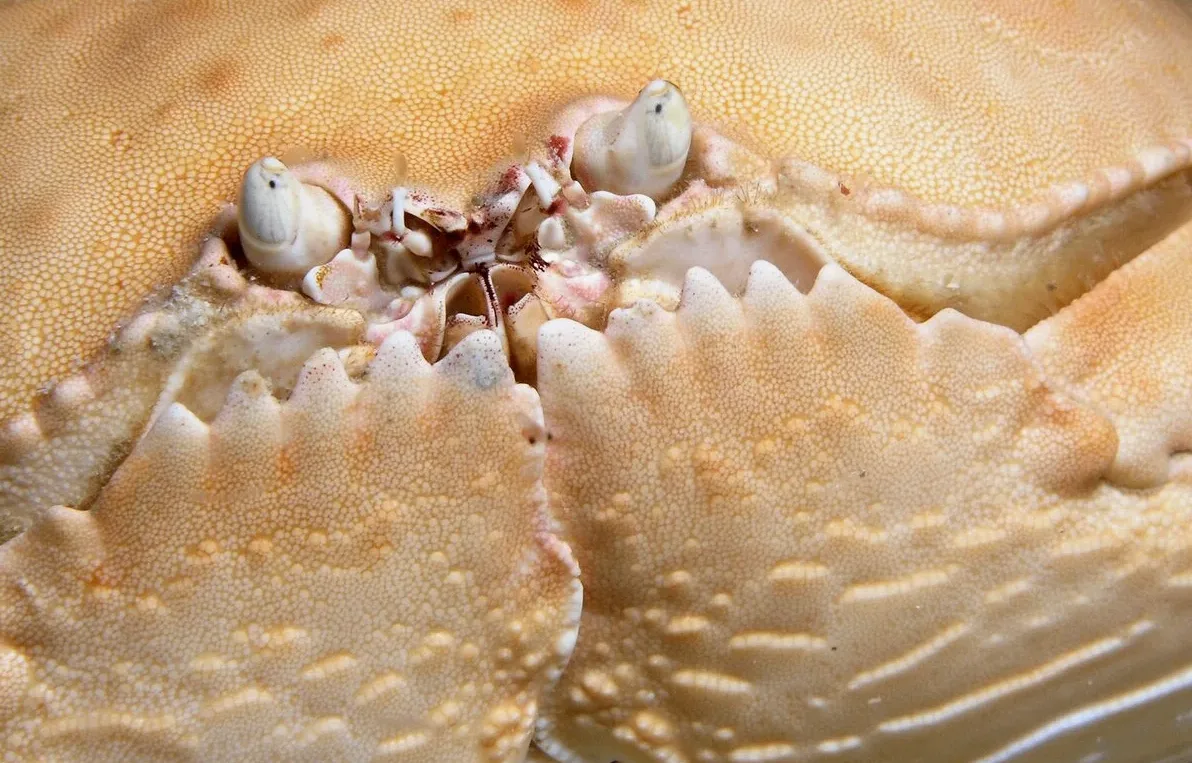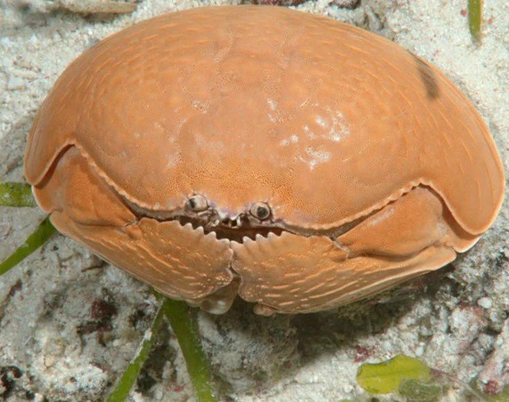 Вы только посмотрите на его доспехи, они превосходны даже по меркам других крабов! Толстый и прочный панцирь с боков загибается книзу и защищает ноги, которые сами по себе бронированы на отлично, кстати. Благодаря такому строению карапакса, краб может принимать превосходную оборонительную позу. Если он прижмёт к себе клешни и ходильные ноги, то превратится в 15-сантиметровую овальную бронированную печенюху почти без зазоров в броне! Ну чем тебе не рыцарь?