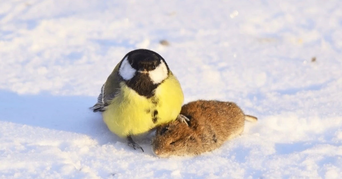 От голода большие синицы нападают на любых птиц, что мельче них самих или даже равны им по размеру. Под прицелом лазорёвки, чечетки, овсянки, желтоголовые корольки и некоторые другие, включая самих же синиц. Особенно страдают от издевательств крошечные 5-сантиметровые летучие мышки нетопыри-карлики.