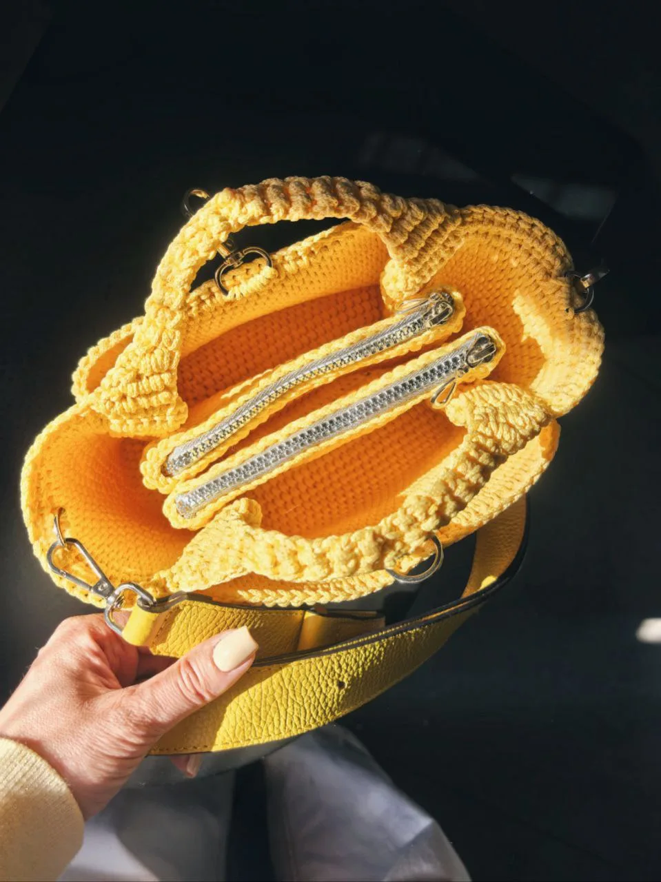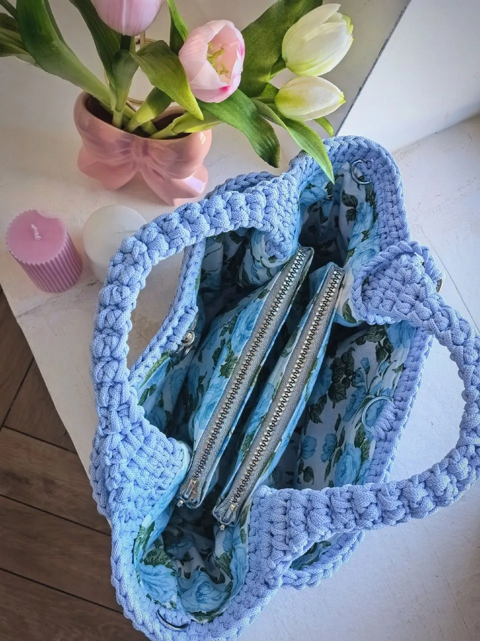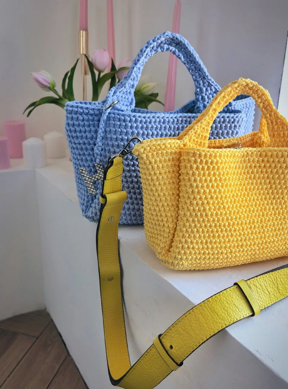 Голубая сумка из полиэфирного шнура 4 мм, желтая 2 мм