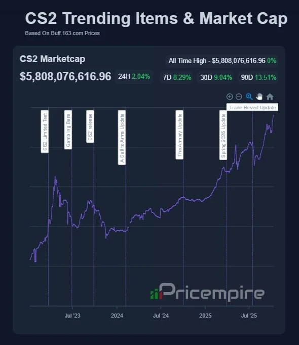 Рынок скинов CS2 побил исторический рекорд — его капитализация превысила $5,8 млрд. С апреля рынок вырос на $1,3 млрд из-за наплыва китайских инвестиций. Только за этот год игроки открыли свыше 400 млн кейсов.